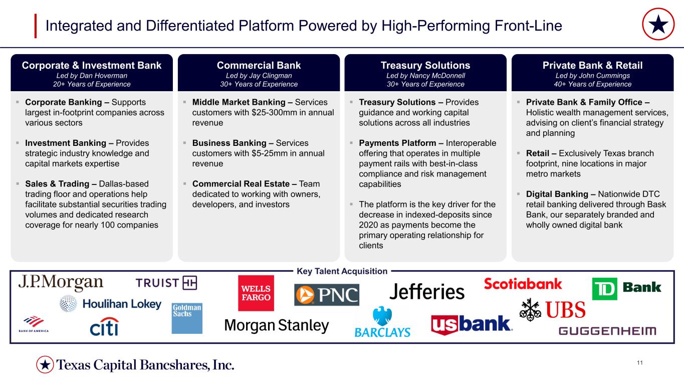10 Proven Executive Leadership with Large Top-Tier Financial Institution Experience Footnotes for slide Rob Holmes Chairman, President & Chief Executive Officer Tenure: 5 years Experience: 30+ years Anna Alvarado-Pearce Chief Legal Officer & Corporate Secretary Tenure: 4 years Experience: 15+ years Jay Clingman Head of Commercial Banking Tenure: 4 years Experience: 30+ years John Cummings Chief Administrative Officer Tenure: 4 years Experience: 40+ years Donald Goin Chief Information Officer Tenure: 4 years Experience: 20+ years Daniel Hoverman Head of Corporate & Investment Banking Tenure: 4 years Experience: 20+ Years Matt Scurlock Chief Financial Officer Tenure: 12 years Experience: 15+ years Nancy McDonnell Head of Treasury Solutions Tenure: 5 years Experience: 30+ years David Oman Chief Risk Officer Tenure: 2 years Experience: 30+ years David Youngberg Chief Credit Officer Tenure: 3 years Experience: 20+ years