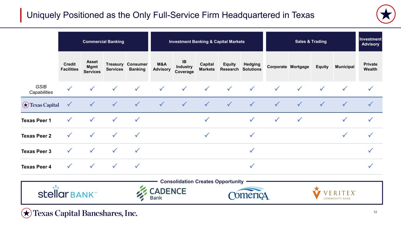 11 ▪ Corporate Banking – Supports largest in-footprint companies across various sectors ▪ Investment Banking – Provides strategic industry knowledge and capital markets expertise ▪ Sales & Trading – Dallas-based trading floor and operations help facilitate substantial securities trading volumes and dedicated research coverage for nearly 100 companies ▪ Middle Market Banking – Services customers with $25-300mm in annual revenue ▪ Business Banking – Services customers with $5-25mm in annual revenue ▪ Commercial Real Estate – Team dedicated to working with owners, developers, and investors ▪ Treasury Solutions – Provides guidance and working capital solutions across all industries ▪ Payments Platform – Interoperable offering that operates in multiple payment rails with best-in-class compliance and risk management capabilities ▪ The platform is the key driver for the decrease in indexed-deposits since 2020 as payments become the primary operating relationship for clients ▪ Private Bank & Family Office – Holistic wealth management services, advising on client’s financial strategy and planning ▪ Retail – Exclusively Texas branch footprint, nine locations in major metro markets ▪ Digital Banking – Nationwide DTC retail banking delivered through Bask Bank, our separately branded and wholly owned digital bank Integrated and Differentiated Platform Powered by High-Performing Front-Line Footnotes for slide Corporate & Investment Bank Led by Dan Hoverman 20+ Years of Experience Commercial Bank Led by Jay Clingman 30+ Years of Experience Treasury Solutions Led by Nancy McDonnell 30+ Years of Experience Private Bank & Retail Led by John Cummings 40+ Years of Experience Key Talent Acquisition