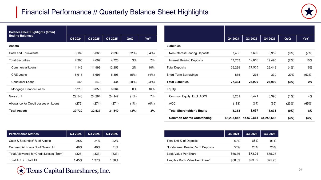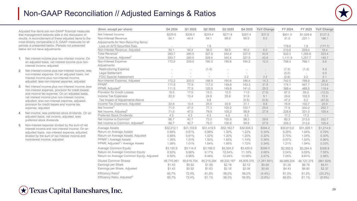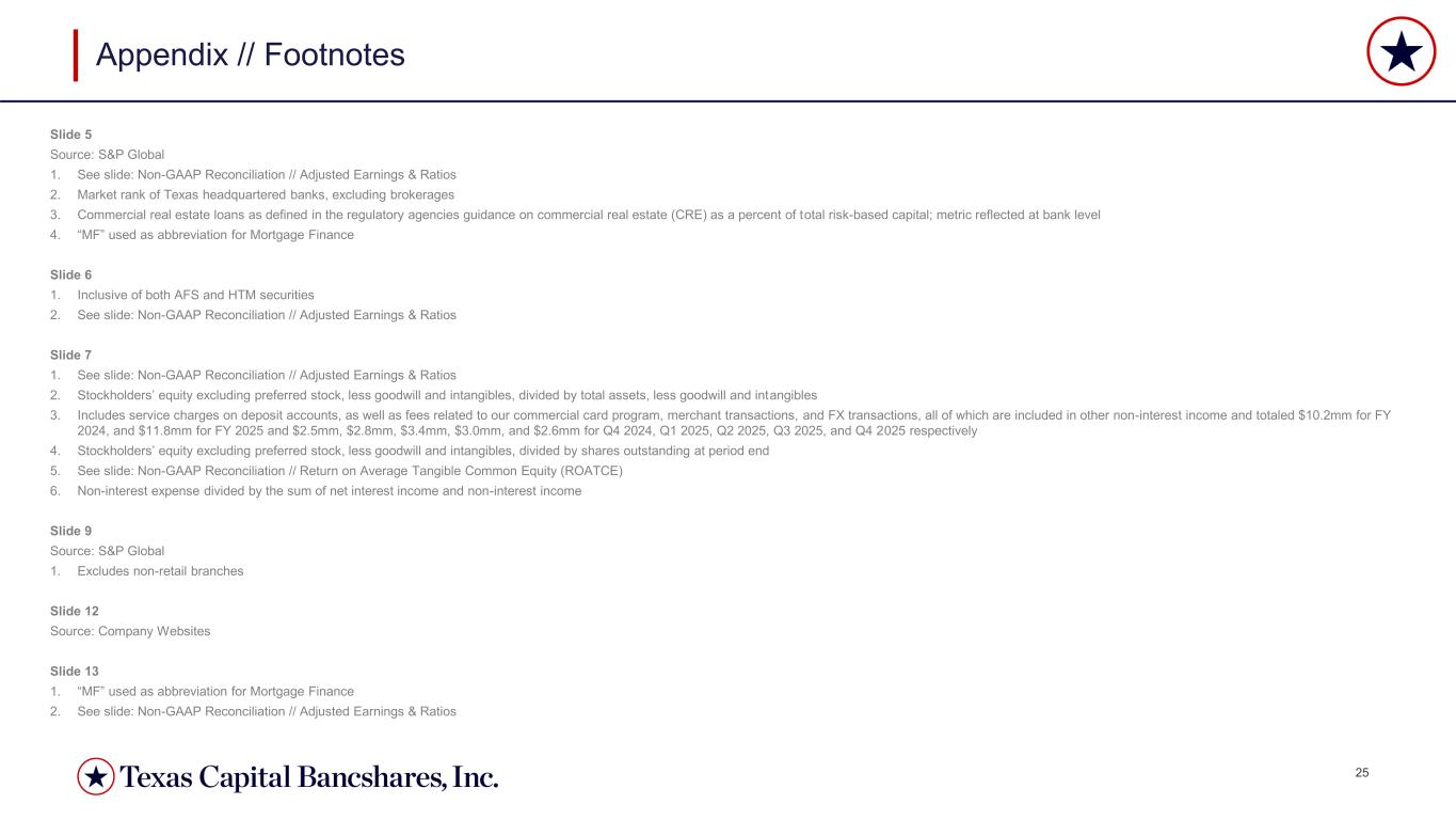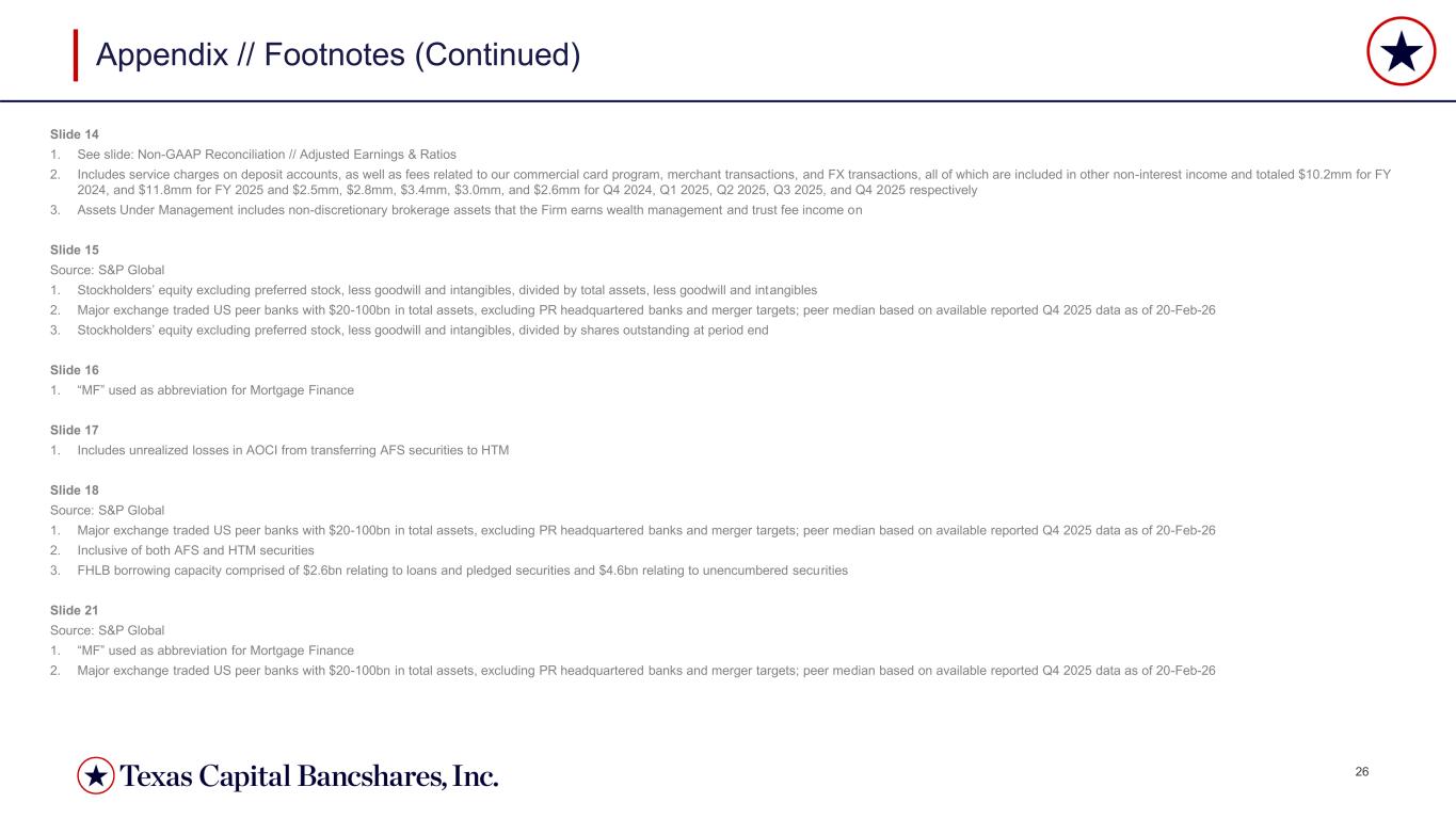 25 Slide 5 Source: S&P Global 1. See slide: Non-GAAP Reconciliation // Adjusted Earnings & Ratios 2. Market rank of Texas headquartered banks, excluding brokerages 3. Commercial real estate loans as defined in the regulatory agencies guidance on commercial real estate (CRE) as a percent of total risk-based capital; metric reflected at bank level 4. “MF” used as abbreviation for Mortgage Finance Slide 6 1. Inclusive of both AFS and HTM securities 2. See slide: Non-GAAP Reconciliation // Adjusted Earnings & Ratios Slide 7 1. See slide: Non-GAAP Reconciliation // Adjusted Earnings & Ratios 2. Stockholders’ equity excluding preferred stock, less goodwill and intangibles, divided by total assets, less goodwill and intangibles 3. Includes service charges on deposit accounts, as well as fees related to our commercial card program, merchant transactions, and FX transactions, all of which are included in other non-interest income and totaled $10.2mm for FY 2024, and $11.8mm for FY 2025 and $2.5mm, $2.8mm, $3.4mm, $3.0mm, and $2.6mm for Q4 2024, Q1 2025, Q2 2025, Q3 2025, and Q4 2025 respectively 4. Stockholders’ equity excluding preferred stock, less goodwill and intangibles, divided by shares outstanding at period end 5. See slide: Non-GAAP Reconciliation // Return on Average Tangible Common Equity (ROATCE) 6. Non-interest expense divided by the sum of net interest income and non-interest income Slide 9 Source: S&P Global 1. Excludes non-retail branches Slide 12 Source: Company Websites Slide 13 1. “MF” used as abbreviation for Mortgage Finance 2. See slide: Non-GAAP Reconciliation // Adjusted Earnings & Ratios Appendix // Footnotes