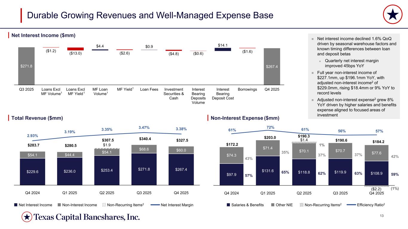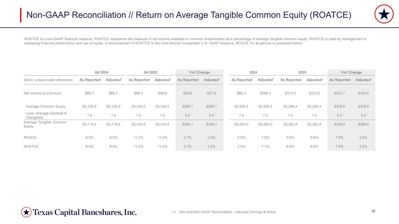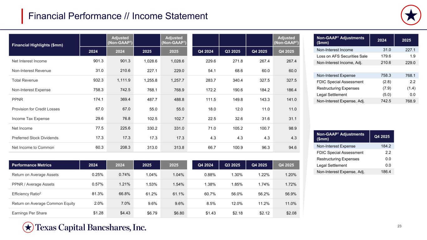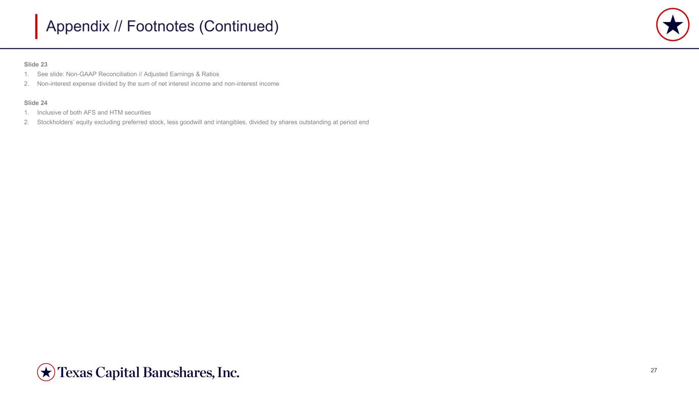 25 Slide 5 Source: S&P Global 1. See slide: Non-GAAP Reconciliation // Adjusted Earnings & Ratios 2. Market rank of Texas headquartered banks, excluding brokerages 3. Commercial real estate loans as defined in the regulatory agencies guidance on commercial real estate (CRE) as a percent of total risk-based capital; metric reflected at bank level 4. “MF” used as abbreviation for Mortgage Finance Slide 6 1. Inclusive of both AFS and HTM securities 2. See slide: Non-GAAP Reconciliation // Adjusted Earnings & Ratios Slide 7 1. See slide: Non-GAAP Reconciliation // Adjusted Earnings & Ratios 2. Stockholders’ equity excluding preferred stock, less goodwill and intangibles, divided by total assets, less goodwill and intangibles 3. Includes service charges on deposit accounts, as well as fees related to our commercial card program, merchant transactions, and FX transactions, all of which are included in other non-interest income and totaled $10.2mm for FY 2024, and $11.8mm for FY 2025 and $2.5mm, $2.8mm, $3.4mm, $3.0mm, and $2.6mm for Q4 2024, Q1 2025, Q2 2025, Q3 2025, and Q4 2025 respectively 4. Stockholders’ equity excluding preferred stock, less goodwill and intangibles, divided by shares outstanding at period end 5. See slide: Non-GAAP Reconciliation // Return on Average Tangible Common Equity (ROATCE) 6. Non-interest expense divided by the sum of net interest income and non-interest income Slide 9 Source: S&P Global 1. Excludes non-retail branches Slide 12 Source: Company Websites Slide 13 1. “MF” used as abbreviation for Mortgage Finance 2. See slide: Non-GAAP Reconciliation // Adjusted Earnings & Ratios Appendix // Footnotes