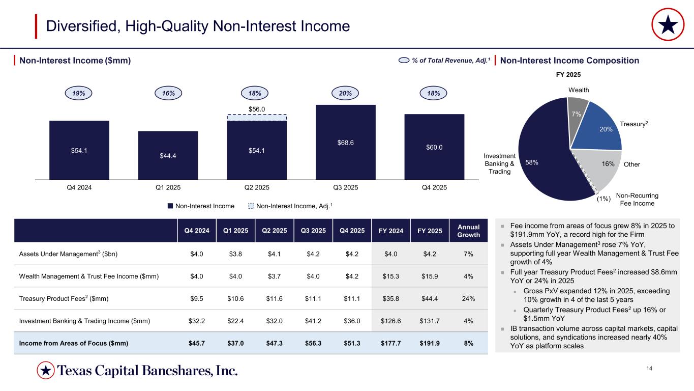 13 $229.6 $236.0 $253.4 $271.8 $267.4 $54.1 $44.4 $54.1 $68.6 $60.0 $1.9$283.7 $280.5 $307.5 $340.4 $327.5 2.93% 3.19% 3.35% 3.47% 3.38% Q4 2024 Q1 2025 Q2 2025 Q3 2025 Q4 2025 $271.8 ($1.2) ($13.0) $4.4 ($2.6) $0.9 ($4.8) ($0.6) $14.1 ($1.6) $267.4 Q3 2025 Loans Excl MF Volume Loans Excl MF Yield MF Loan Volume MF Yield Loan Fees Investment Securities & Cash Interest Bearing Deposits Volume Interest Bearing Deposit Cost Borrowings Q4 2025 57% 65% 62% 63% Durable Growing Revenues and Well-Managed Expense Base Net Interest Income ($mm) Total Revenue ($mm) Non-Interest Expense ($mm) 59% 1 1 1 1 42% 35% 37% Net Interest Income Non-Recurring Items2 43% 37% 1% (1%) Non-Interest Income Net Interest Margin ◼ Net interest income declined 1.6% QoQ driven by seasonal warehouse factors and known timing differences between loan and deposit betas ◼ Quarterly net interest margin improved 45bps YoY ◼ Full year non-interest income of $227.1mm, up $196.1mm YoY, with adjusted non-interest income2 of $229.0mm, rising $18.4mm or 9% YoY to record levels ◼ Adjusted non-interest expense2 grew 8% YoY driven by higher salaries and benefits expense aligned to focused areas of investment Salaries & Benefits Other NIE Non-Recurring Items2 Efficiency Ratio2 $97.9 $131.6 $118.8 $119.9 $108.9 $74.3 $71.4 $70.1 $70.7 $77.6 $1.4 ($2.2) $172.2 $203.0 $190.3 $190.6 $184.2 61% 72% 61% 56% 57% Q4 2024 Q1 2025 Q2 2025 Q3 2025 Q4 2025 Footnotes for slide 1. “MF” used as abbreviation for Mortgage Finance 2. See slide: Non-GAAP Reconciliation // Adjusted Earnings & Ratios