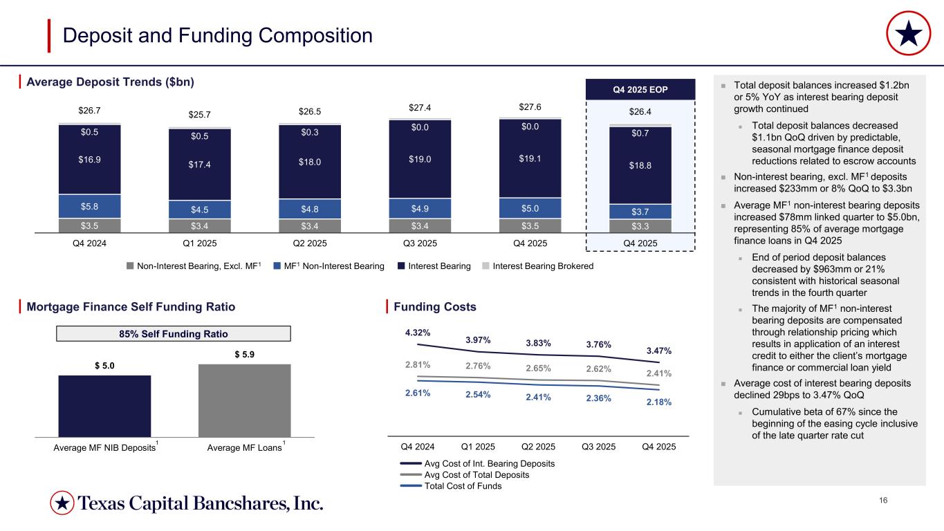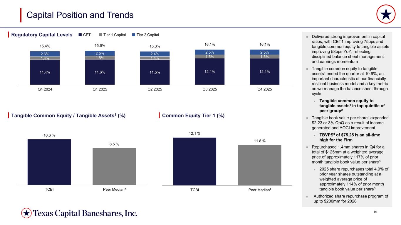 15 11.4% 11.6% 11.5% 12.1% 12.1% 1.4% 1.5% 1.4% 1.5% 1.5% 2.6% 2.5% 2.4% 2.5% 2.5% 15.4% 15.6% 15.3% 16.1% 16.1% Q4 2024 Q1 2025 Q2 2025 Q3 2025 Q4 2025 Tangible Common Equity / Tangible Assets1 Common Equity / Total Assets Capital Position and Trends ◼ Delivered strong improvement in capital ratios, with CET1 improving 75bps and tangible common equity to tangible assets improving 58bps YoY, reflecting disciplined balance sheet management and earnings momentum ◼ Tangible common equity to tangible assets1 ended the quarter at 10.6%, an important characteristic of our financially resilient business model and a key metric as we manage the balance sheet through- cycle ◼ Tangible common equity to tangible assets1 in top quintile of peer group2 ◼ Tangible book value per share3 expanded $2.23 or 3% QoQ as a result of income generated and AOCI improvement ◼ TBVPS3 of $75.25 is an all-time high for the Firm ◼ Repurchased 1.4mm shares in Q4 for a total of $125mm at a weighted average price of approximately 117% of prior month tangible book value per share3 ◼ 2025 share repurchases total 4.9% of prior year shares outstanding at a weighted average price of approximately 114% of prior month tangible book value per share3 ◼ Authorized share repurchase program of up to $200mm for 2026 Regulatory Capital Levels Tangible Common Equity / Tangible Assets1 (%) CET1 Tier 1 Capital Tier 2 Capital Common Equity Tier 1 (%) Footnotes for slide Source: SNL 1. Stockholders’ equity excluding preferred stock, less goodwill and intangibles, divided by total assets, less goodwill and intangibles 2. Major exchange traded US peer banks with $20-100bn in total assets, excluding PR headquartered banks and merger targets; Source: S&P Capital IQ Pro; peer data as of MRQ 3. Stockholders’ equity excluding preferred stock, less goodwill and intangibles, divided by shares outstanding at period end 10.6 % 8.5 % TCBI Peer Median² 12.1 % 11.8 % TCBI Peer Median²