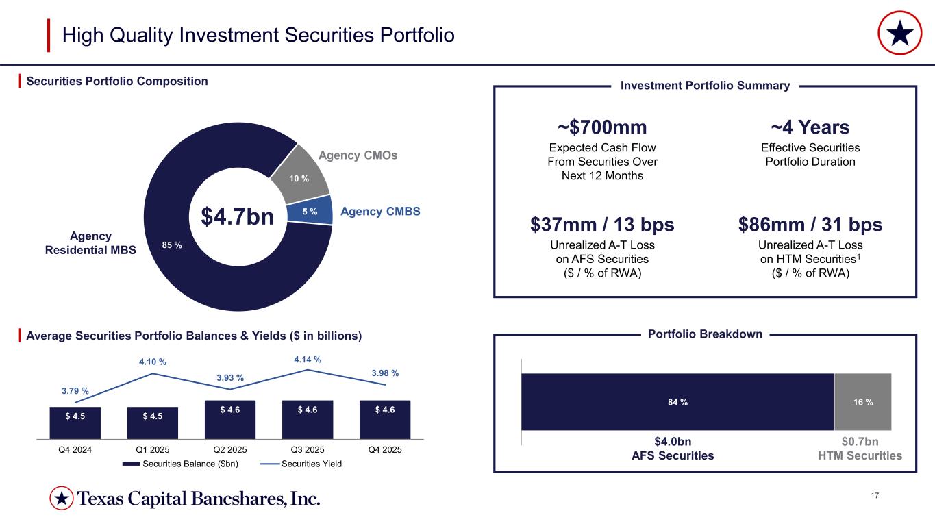 16 2.81% 2.76% 2.65% 2.62% 2.41% 2.61% 2.54% 2.41% 2.36% 2.18% 4.32% 3.97% 3.83% 3.76% 3.47% Q4 2024 Q1 2025 Q2 2025 Q3 2025 Q4 2025 $3.5 $3.4 $3.4 $3.4 $3.5 $3.3 $5.8 $4.5 $4.8 $4.9 $5.0 $3.7 $16.9 $17.4 $18.0 $19.0 $19.1 $18.8 $0.5 $0.5 $0.3 $0.0 $0.0 $0.7 $26.7 $25.7 $26.5 $27.4 $27.6 $26.4 Q4 2024 Q1 2025 Q2 2025 Q3 2025 Q4 2025 Q4 2025 Q4 2025 EOP Deposit and Funding Composition ◼ Total deposit balances increased $1.2bn or 5% YoY as interest bearing deposit growth continued ◼ Total deposit balances decreased $1.1bn QoQ driven by predictable, seasonal mortgage finance deposit reductions related to escrow accounts ◼ Non-interest bearing, excl. MF1 deposits increased $233mm or 8% QoQ to $3.3bn ◼ Average MF1 non-interest bearing deposits increased $78mm linked quarter to $5.0bn, representing 85% of average mortgage finance loans in Q4 2025 ◼ End of period deposit balances decreased by $963mm or 21% consistent with historical seasonal trends in the fourth quarter ◼ The majority of MF1 non-interest bearing deposits are compensated through relationship pricing which results in application of an interest credit to either the client’s mortgage finance or commercial loan yield ◼ Average cost of interest bearing deposits declined 29bps to 3.47% QoQ ◼ Cumulative beta of 67% since the beginning of the easing cycle inclusive of the late quarter rate cut Average Deposit Trends ($bn) Mortgage Finance Self Funding Ratio Funding Costs Avg Cost of Total Deposits Total Cost of Funds Avg Cost of Int. Bearing Deposits Non-Interest Bearing, Excl. MF1 MF1 Non-Interest Bearing Interest Bearing Interest Bearing Brokered Footnotes for slide 1. “MF” used as abbreviation for Mortgage Finance 85% Self Funding Ratio $ 5.0 $ 5.9 Average MF NIB Deposits Average MF Loans 1 1