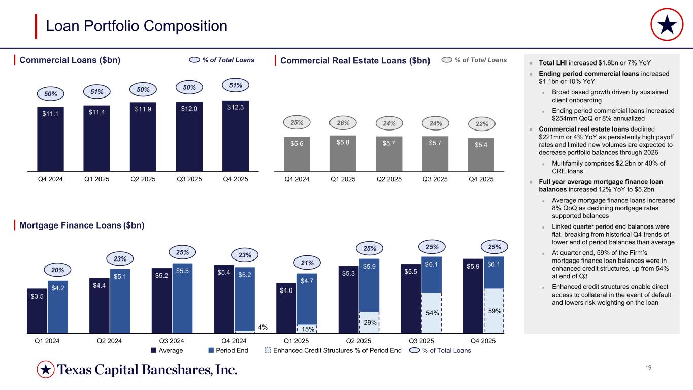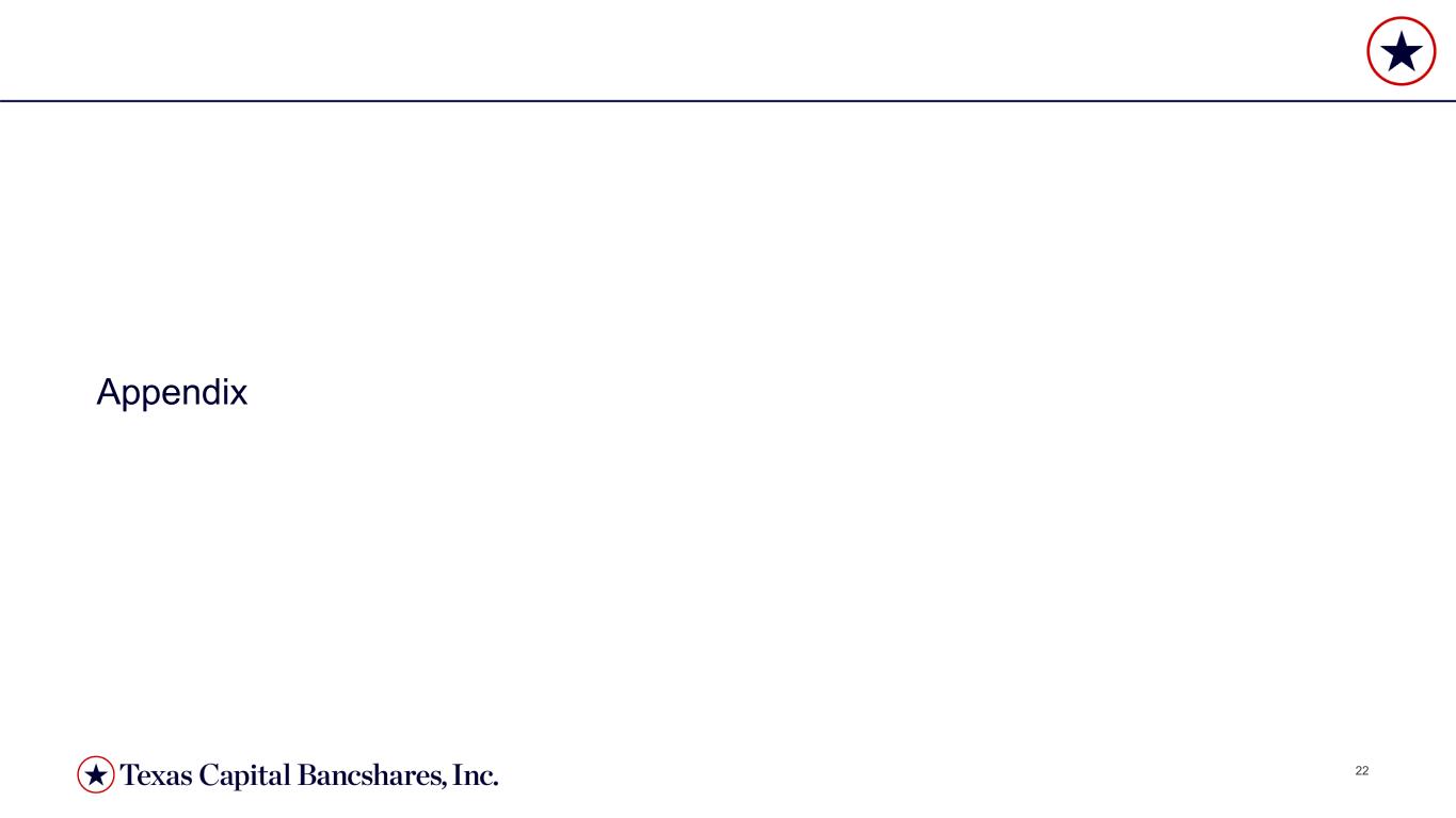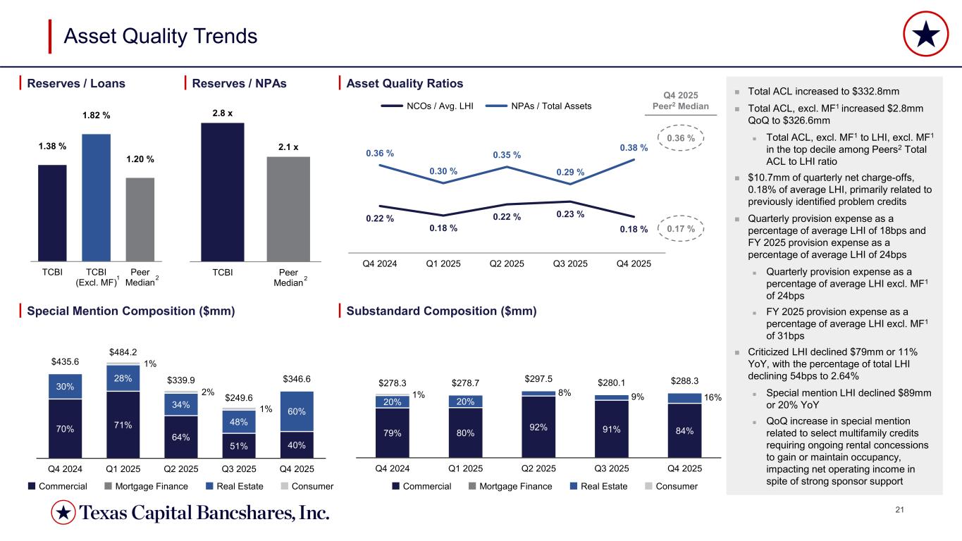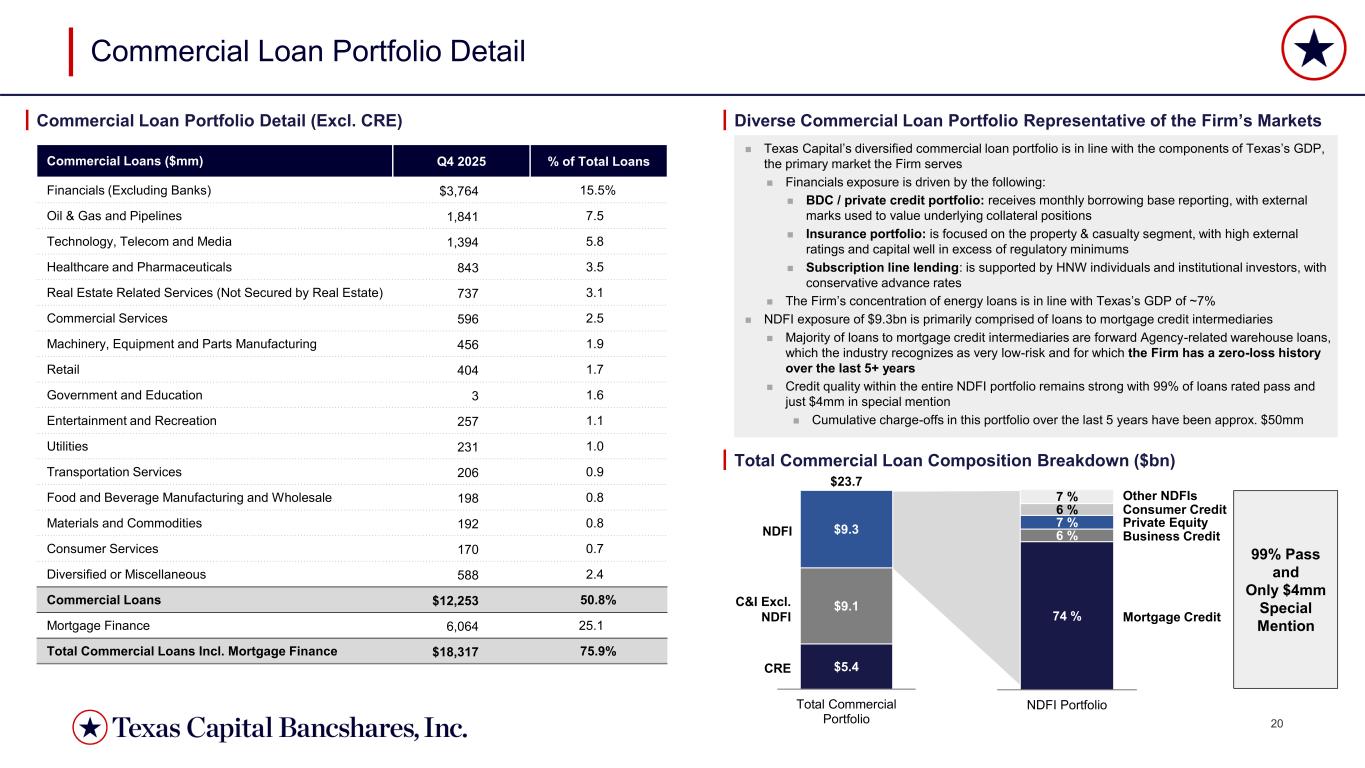 20 74 % 6 % 7 % 6 % 7 % NDFI Portfolio Commercial Loan Portfolio Detail (Excl. CRE) Diverse Commercial Loan Portfolio Representative of the Firm’s Markets Total Commercial Loan Composition Breakdown ($bn) Commercial Loans ($mm) Q4 2025 % of Total Loans Financials (Excluding Banks) $3,764 15.5% Oil & Gas and Pipelines 1,841 7.5 Technology, Telecom and Media 1,394 5.8 Healthcare and Pharmaceuticals 843 3.5 Real Estate Related Services (Not Secured by Real Estate) 737 3.1 Commercial Services 596 2.5 Machinery, Equipment and Parts Manufacturing 456 1.9 Retail 404 1.7 Government and Education 3 1.6 Entertainment and Recreation 257 1.1 Utilities 231 1.0 Transportation Services 206 0.9 Food and Beverage Manufacturing and Wholesale 198 0.8 Materials and Commodities 192 0.8 Consumer Services 170 0.7 Diversified or Miscellaneous 588 2.4 Commercial Loans $12,253 50.8% Mortgage Finance 6,064 25.1 Total Commercial Loans Incl. Mortgage Finance $18,317 75.9% NDFI C&I Excl. NDFI Mortgage Credit Business Credit Private Equity Consumer Credit Other NDFIs ◼ Texas Capital’s diversified commercial loan portfolio is in line with the components of Texas’s GDP, the primary market the Firm serves ◼ Financials exposure is driven by the following: ◼ BDC / private credit portfolio: receives monthly borrowing base reporting, with external marks used to value underlying collateral positions ◼ Insurance portfolio: is focused on the property & casualty segment, with high external ratings and capital well in excess of regulatory minimums ◼ Subscription line lending: is supported by HNW individuals and institutional investors, with conservative advance rates ◼ The Firm’s concentration of energy loans is in line with Texas’s GDP of ~7% ◼ NDFI exposure of $9.3bn is primarily comprised of loans to mortgage credit intermediaries ◼ Majority of loans to mortgage credit intermediaries are forward Agency-related warehouse loans, which the industry recognizes as very low-risk and for which the Firm has a zero-loss history over the last 5+ years ◼ Credit quality within the entire NDFI portfolio remains strong with 99% of loans rated pass and just $4mm in special mention ◼ Cumulative charge-offs in this portfolio over the last 5 years have been approx. $50mm #191947 #7F7F7F #2F5597 #C7C8C A #EDEDE D #DEEBF 7 Commercial Loan Portfolio Detail 99% Pass and Only $4mm Special Mention $23.7 CRE $5.4 $9.1 $9.3 Total Commercial Portfolio
