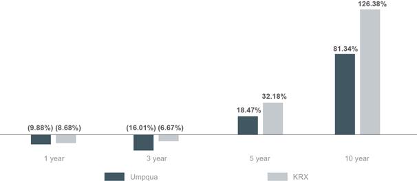 Dollar value of restricted stock and performance share awards that would vest upon the event calculated at $15.14 per share, the closing price of Umpqua’s stock on December 31, 2020. |