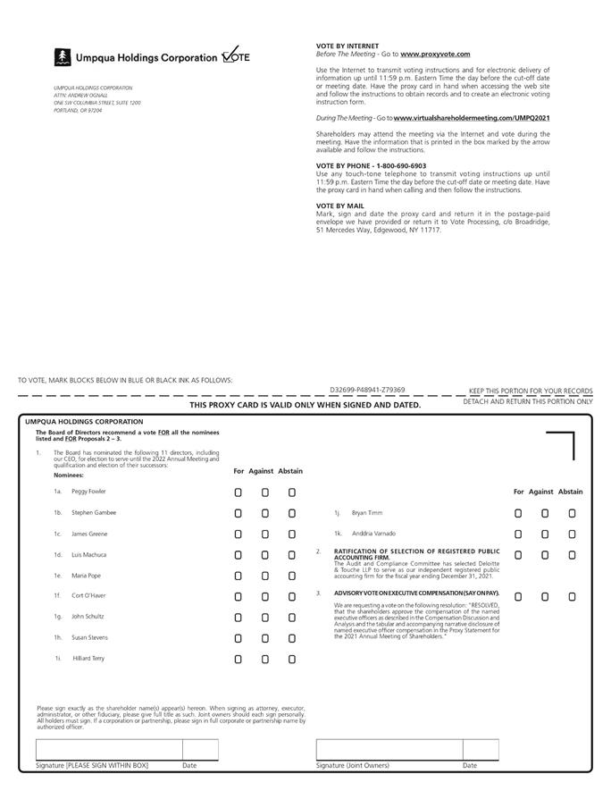 Company logo VOTE BY INTERNET Before The Meeting - Go to www.proxyvote.com Use the Internet to transmit voting instructions and for electronic delivery of information up until 11:59 p.m. Eastern Time the day before the cut-off date or meeting date. Have the proxy card in hand when accessing the web site and follow the instructions to obtain records and to create an electronic voting instruction form. During The Meeting - Go to www.virtualshareholdermeeting.com/UMPQ2021 Shareholders may attend the meeting via the Internet and vote during the meeting. Have the information that is printed in the box marked by the arrow available and follow the instructions. VOTE BY PHONE - 1-800-690-6903 Use any touch-tone telephone to transmit voting instructions up until 11:59 p.m. Eastern Time the day before the cut-off date or meeting date. Have the proxy card in hand when calling and then follow the instructions. VOTE BY MAIL Mark, sign and date the proxy card and return it in the postage-paid envelope we have provided or return it to Vote Processing, c/o Broadridge, 51 Mercedes Way, Edgewood, NY 11717. UMPQUA HOLDINGS CORPORATION ATTN: ANDREW OGNALL ONE SW COLUMBIA STREET, SUITE 1200 PORTLAND, OR 97204 D32699-P48941-Z79369 UMPQUA HOLDINGS CORPORATION The Board of Directors recommend a vote FOR all the nominees listed and FOR Proposals 2 – 3. 1. The Board has nominated the following 11 directors, including our CEO, for election to serve until the 2022 Annual Meeting and qualification and election of their successors: Abstain For Against Nominees: 1a. Peggy Fowler For Against Abstain 1b. Stephen Gambee 1j. Bryan Timm 1k. Anddria Varnado 1c. James Greene 2. RATIFICATION OF SELECTION OF REGISTERED PUBLIC ACCOUNTING FIRM. The Audit and Compliance Committee has selected Deloitte & Touche LLP to serve as our independent registered public accounting firm for the fiscal year ending December 31, 2021. 1d. Luis Machuca 1e. Maria Pope 3. ADVISORY VOTE ON EXECUTIVE COMPENSATION (SAY ON PAY). We are requesting a vote on the following resolution: "RESOLVED, that the shareholders approve the compensation of the named executive officers as described in the Compensation Discussion and Analysis and the tabular and accompanying narrative disclosure of named executive officer compensation in the Proxy Statement for the 2021 Annual Meeting of Shareholders."1f. Cort O’Haver 1g. John Schultz 1h. Susan Stevens 1i. Hilliard Terry Please sign exactly as the shareholder name(s) appear(s) hereon. When signing as attorney, executor, administrator, or other fiduciary, please give full title as such. Joint owners should each sign personally. All holders must sign. If a corporation or partnership, please sign in full corporate or partnership name by authorized officer. TO VOTE, MARK BLOCKS BELOW IN BLUE OR BLACK INK AS FOLLOWS: KEEP THIS PORTION FOR YOUR RECORDS THIS PROXY CARD IS VALID ONLY WHEN SIGNED AND DATED. DETACH AND RETURN THIS PORTION ONLY D32699-P48941-Z79369 Signature [PLEASE SIGN WITHIN BOX] Date Signature (Joint Owners) Date