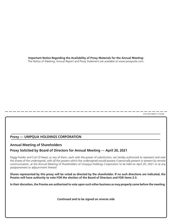 Important Notice Regarding the Availability of Proxy Materials for the Annual Meeting:The Notice of Meeting, Annual Report and Proxy Statement are available at www.proxyvote.com. D32700-P48941-Z79369 Proxy — UMPQUA HOLDINGS CORPORATION Annual Meeting of Shareholders Proxy Solicited by Board of Directors for Annual Meeting — April 20, 2021 Peggy Fowler and Cort O’Haver, or any of them, each with the power of substitution, are hereby authorized to represent and vote the shares of the undersigned, with all the powers which the undersigned would possess if personally present or present by remote communication, at the Annual Meeting of Shareholders of Umpqua Holdings Corporation to be held on April 20, 2021 or at any postponement or adjournment thereof. Shares represented by this proxy will be voted as directed by the shareholder. If no such directions are indicated, the Proxies will have authority to vote FOR the election of the Board of Directors and FOR items 2-3. In their discretion, the Proxies are authorized to vote upon such other business as may properly come before the meeting. Continued and to be signed on reverse side