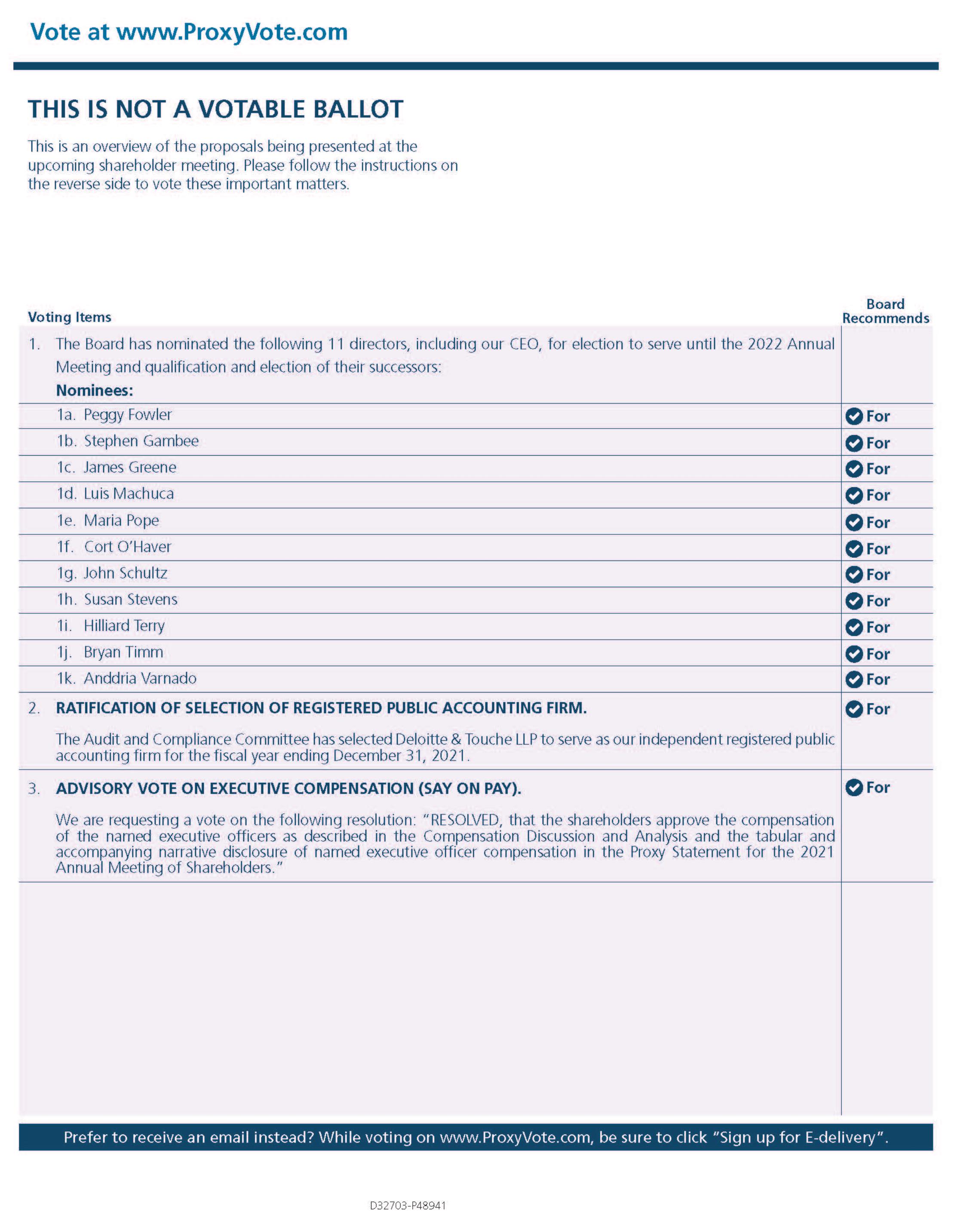 Vote at www.ProxyVote.com This is an overview of the proposals being presented at the upcoming shareholder meeting. Please follow the instructions on the reverse side to vote these important matters. Board Recommends Voting Items 1. The Board has nominated the following 11 directors, including our CEO, for election to serve until the 2022 Annual Meeting and qualification and election of their successors: Nominees: 1a. Peggy Fowler 1b. Stephen Gambee 1c. James Greene 1d. Luis Machuca 1e. Maria Pope 1f. Cort O’Haver 1g. John Schultz 1h. Susan Stevens 1i. Hilliard Terry 1j. Bryan Timm 1k. Anddria Varnado 2. RATIFICATION OF SELECTION OF REGISTERED PUBLIC ACCOUNTING FIRM. The Audit and Compliance Committee has selected Deloitte & Touche LLP to serve as our independent registered public accounting firm for the fiscal year ending December 31, 2021. 3. ADVISORY VOTE ON EXECUTIVE COMPENSATION (SAY ON PAY). We are requesting a vote on the following resolution: “RESOLVED, that the shareholders approve the compensation of the named executive officers as described in the Compensation Discussion and Analysis and the tabular and accompanying narrative disclosure of named executive officer compensation in the Proxy Statement for the 2021 Annual Meeting of Shareholders.” D32703-P48941 For For For For For For For For For For For For For Prefer to receive an email instead? While voting on www.ProxyVote.com, be sure to click “Sign up for E-delivery”.