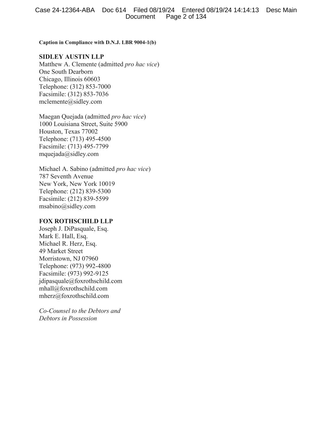 Caption in Compliance with D.N.J. LBR 9004-1(b) SIDLEY AUSTIN LLP Matthew A. Clemente (admitted pro hac vice) One South Dearborn Chicago, Illinois 60603 Telephone: (312) 853-7000 Facsimile: (312) 853-7036 mclemente@sidley.com Maegan Quejada (admitted pro hac vice) 1000 Louisiana Street, Suite 5900 Houston, Texas 77002 Telephone: (713) 495-4500 Facsimile: (713) 495-7799 mquejada@sidley.com Michael A. Sabino (admitted pro hac vice) 787 Seventh Avenue New York, New York 10019 Telephone: (212) 839-5300 Facsimile: (212) 839-5599 msabino@sidley.com FOX ROTHSCHILD LLP Joseph J. DiPasquale, Esq. Mark E. Hall, Esq. Michael R. Herz, Esq. 49 Market Street Morristown, NJ 07960 Telephone: (973) 992-4800 Facsimile: (973) 992-9125 jdipasquale@foxrothschild.com mhall@foxrothschild.com mherz@foxrothschild.com Co-Counsel to the Debtors and Debtors in Possession Case 24-12364-ABA Doc 614 Filed 08/19/24 Entered 08/19/24 14:14:13 Desc Main Document Page 2 of 134
