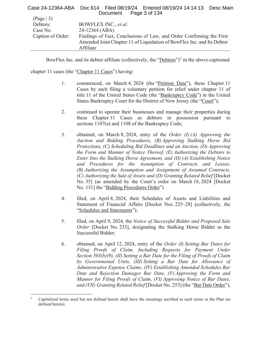 (Page | 3) Debtors: BOWFLEX INC., et al. Case No. 24-12364 (ABA) Caption of Order: Findings of Fact, Conclusions of Law, and Order Confirming the First Amended Joint Chapter 11 of Liquidation of BowFlex Inc. and Its Debtor Affiliate BowFlex Inc. and its debtor affiliate (collectively, the “Debtors”)2 in the above-captioned chapter 11 cases (the “Chapter 11 Cases”) having: 1. commenced, on March 4, 2024 (the “Petition Date”), these Chapter 11 Cases by each filing a voluntary petition for relief under chapter 11 of title 11 of the United States Code (the “Bankruptcy Code”) in the United States Bankruptcy Court for the District of New Jersey (the “Court”); 2. continued to operate their businesses and manage their properties during these Chapter 11 Cases as debtors in possession pursuant to sections 1107(a) and 1108 of the Bankruptcy Code; 3. obtained, on March 8, 2024, entry of the Order (I) (A) Approving the Auction and Bidding Procedures, (B) Approving Stalking Horse Bid Protections, (C) Scheduling Bid Deadlines and an Auction, (D) Approving the Form and Manner of Notice Thereof, (E) Authorizing the Debtors to Enter Into the Stalking Horse Agreement, and (II) (A) Establishing Notice and Procedures for the Assumption of Contracts and Leases, (B) Authorizing the Assumption and Assignment of Assumed Contracts, (C) Authorizing the Sale of Assets and (D) Granting Related Relief [Docket No. 35] (as amended by the Court’s order on March 18, 2024 [Docket No. 131] the “Bidding Procedures Order”) 4. filed, on April 8, 2024, their Schedules of Assets and Liabilities and Statement of Financial Affairs [Docket Nos. 225–28] (collectively, the “Schedules and Statements”); 5. filed, on April 9, 2024, the Notice of Successful Bidder and Proposed Sale Order [Docket No. 233], designating the Stalking Horse Bidder as the Successful Bidder; 6. obtained, on April 12, 2024, entry of the Order (I) Setting Bar Dates for Filing Proofs of Claim, Including Requests for Payment Under Section 503(b)(9), (II) Setting a Bar Date for the Filing of Proofs of Claim by Governmental Units, (III) Setting a Bar Date for Allowance of Administrative Expense Claims, (IV) Establishing Amended Schedules Bar Date and Rejection Damages Bar Date, (V) Approving the Form and Manner for Filing Proofs of Claim, (VI) Approving Notice of Bar Dates, and (VII) Granting Related Relief [Docket No. 253] (the “Bar Date Order”), 2 Capitalized terms used but not defined herein shall have the meanings ascribed to such terms in the Plan (as defined herein). Case 24-12364-ABA Doc 614 Filed 08/19/24 Entered 08/19/24 14:14:13 Desc Main Document Page 3 of 134