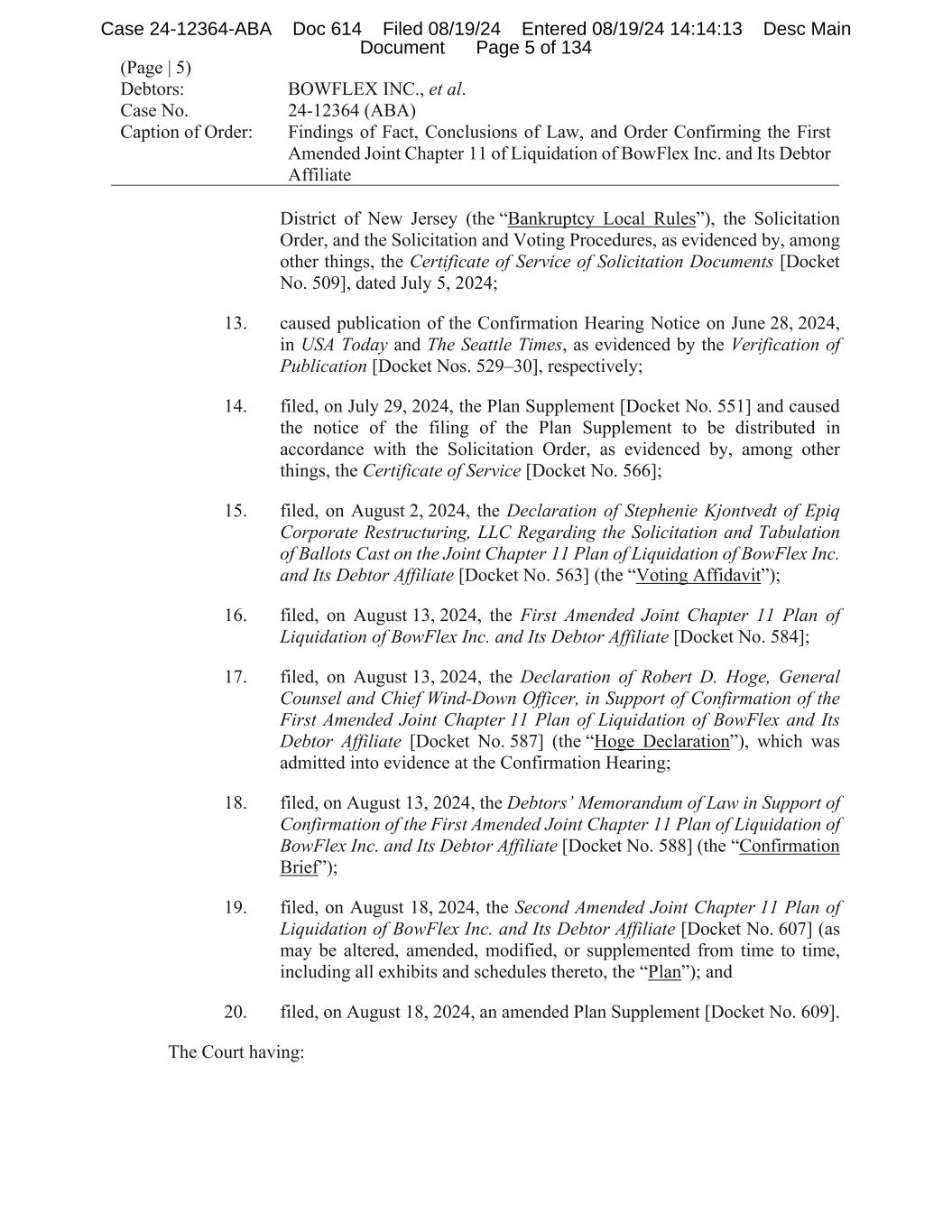 (Page | 5) Debtors: BOWFLEX INC., et al. Case No. 24-12364 (ABA) Caption of Order: Findings of Fact, Conclusions of Law, and Order Confirming the First Amended Joint Chapter 11 of Liquidation of BowFlex Inc. and Its Debtor Affiliate District of New Jersey (the “Bankruptcy Local Rules”), the Solicitation Order, and the Solicitation and Voting Procedures, as evidenced by, among other things, the Certificate of Service of Solicitation Documents [Docket No. 509], dated July 5, 2024; 13. caused publication of the Confirmation Hearing Notice on June 28, 2024, in USA Today and The Seattle Times, as evidenced by the Verification of Publication [Docket Nos. 529–30], respectively; 14. filed, on July 29, 2024, the Plan Supplement [Docket No. 551] and caused the notice of the filing of the Plan Supplement to be distributed in accordance with the Solicitation Order, as evidenced by, among other things, the Certificate of Service [Docket No. 566]; 15. filed, on August 2, 2024, the Declaration of Stephenie Kjontvedt of Epiq Corporate Restructuring, LLC Regarding the Solicitation and Tabulation of Ballots Cast on the Joint Chapter 11 Plan of Liquidation of BowFlex Inc. and Its Debtor Affiliate [Docket No. 563] (the “Voting Affidavit”); 16. filed, on August 13, 2024, the First Amended Joint Chapter 11 Plan of Liquidation of BowFlex Inc. and Its Debtor Affiliate [Docket No. 584]; 17. filed, on August 13, 2024, the Declaration of Robert D. Hoge, General Counsel and Chief Wind-Down Officer, in Support of Confirmation of the First Amended Joint Chapter 11 Plan of Liquidation of BowFlex and Its Debtor Affiliate [Docket No. 587] (the “Hoge Declaration”), which was admitted into evidence at the Confirmation Hearing; 18. filed, on August 13, 2024, the Debtors’ Memorandum of Law in Support of Confirmation of the First Amended Joint Chapter 11 Plan of Liquidation of BowFlex Inc. and Its Debtor Affiliate [Docket No. 588] (the “Confirmation Brief”); 19. filed, on August 18, 2024, the Second Amended Joint Chapter 11 Plan of Liquidation of BowFlex Inc. and Its Debtor Affiliate [Docket No. 607] (as may be altered, amended, modified, or supplemented from time to time, including all exhibits and schedules thereto, the “Plan”); and 20. filed, on August 18, 2024, an amended Plan Supplement [Docket No. 609]. The Court having: Case 24-12364-ABA Doc 614 Filed 08/19/24 Entered 08/19/24 14:14:13 Desc Main Document Page 5 of 134