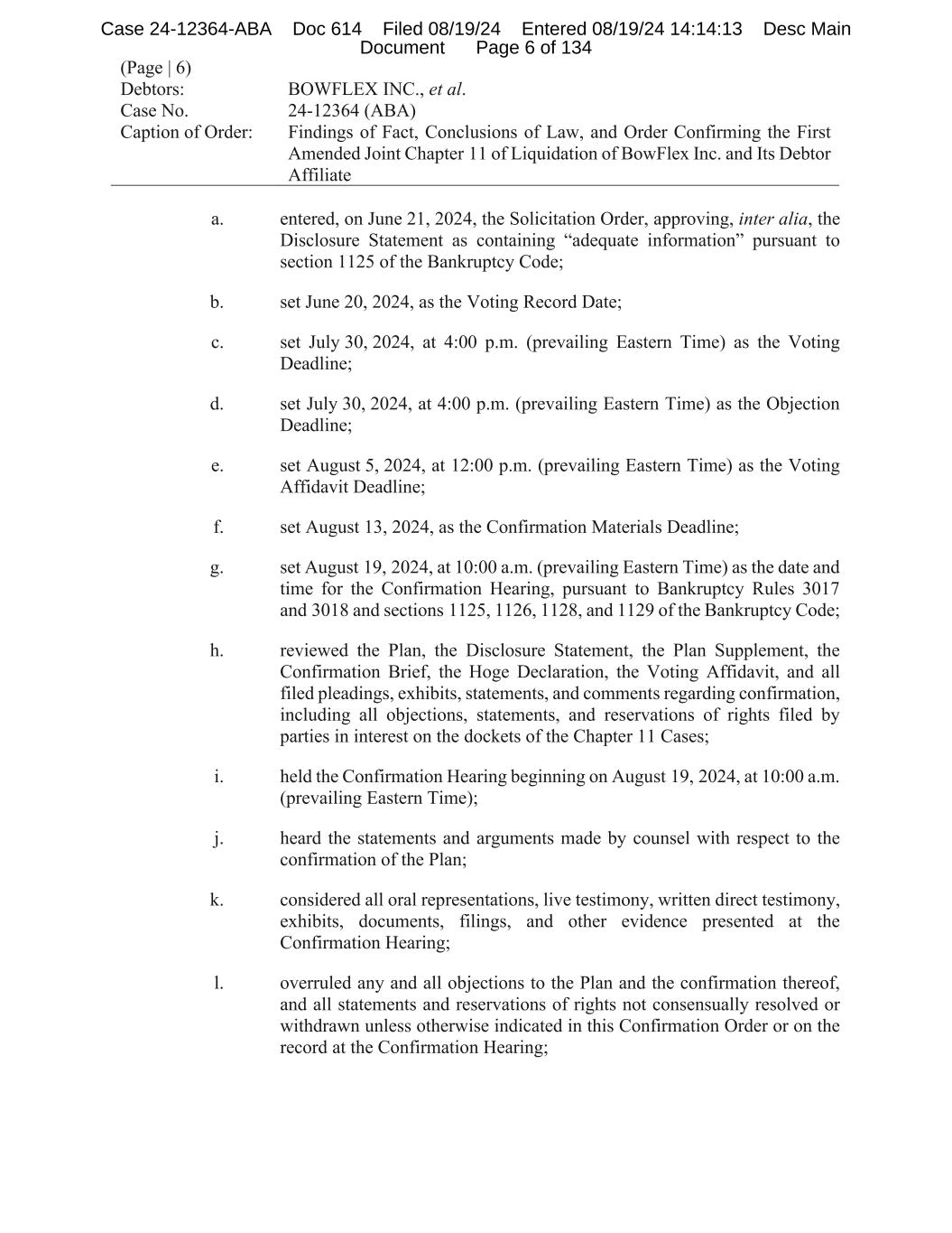 (Page | 6) Debtors: BOWFLEX INC., et al. Case No. 24-12364 (ABA) Caption of Order: Findings of Fact, Conclusions of Law, and Order Confirming the First Amended Joint Chapter 11 of Liquidation of BowFlex Inc. and Its Debtor Affiliate a. entered, on June 21, 2024, the Solicitation Order, approving, inter alia, the Disclosure Statement as containing “adequate information” pursuant to section 1125 of the Bankruptcy Code; b. set June 20, 2024, as the Voting Record Date; c. set July 30, 2024, at 4:00 p.m. (prevailing Eastern Time) as the Voting Deadline; d. set July 30, 2024, at 4:00 p.m. (prevailing Eastern Time) as the Objection Deadline; e. set August 5, 2024, at 12:00 p.m. (prevailing Eastern Time) as the Voting Affidavit Deadline; f. set August 13, 2024, as the Confirmation Materials Deadline; g. set August 19, 2024, at 10:00 a.m. (prevailing Eastern Time) as the date and time for the Confirmation Hearing, pursuant to Bankruptcy Rules 3017 and 3018 and sections 1125, 1126, 1128, and 1129 of the Bankruptcy Code; h. reviewed the Plan, the Disclosure Statement, the Plan Supplement, the Confirmation Brief, the Hoge Declaration, the Voting Affidavit, and all filed pleadings, exhibits, statements, and comments regarding confirmation, including all objections, statements, and reservations of rights filed by parties in interest on the dockets of the Chapter 11 Cases; i. held the Confirmation Hearing beginning on August 19, 2024, at 10:00 a.m. (prevailing Eastern Time); j. heard the statements and arguments made by counsel with respect to the confirmation of the Plan; k. considered all oral representations, live testimony, written direct testimony, exhibits, documents, filings, and other evidence presented at the Confirmation Hearing; l. overruled any and all objections to the Plan and the confirmation thereof, and all statements and reservations of rights not consensually resolved or withdrawn unless otherwise indicated in this Confirmation Order or on the record at the Confirmation Hearing; Case 24-12364-ABA Doc 614 Filed 08/19/24 Entered 08/19/24 14:14:13 Desc Main Document Page 6 of 134