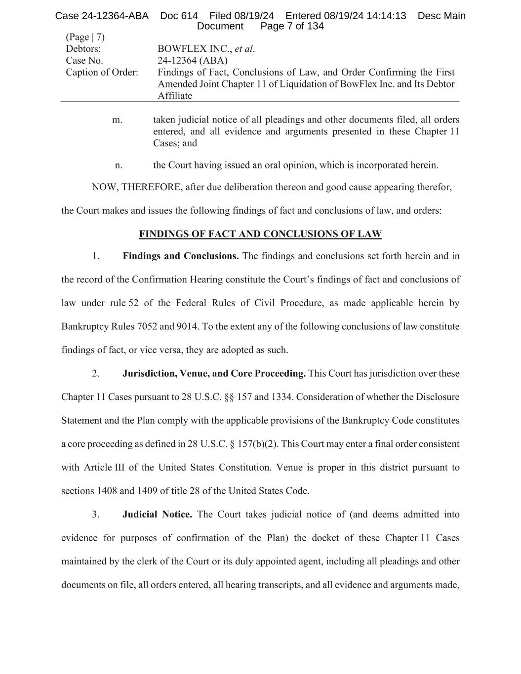 (Page | 7) Debtors: BOWFLEX INC., et al. Case No. 24-12364 (ABA) Caption of Order: Findings of Fact, Conclusions of Law, and Order Confirming the First Amended Joint Chapter 11 of Liquidation of BowFlex Inc. and Its Debtor Affiliate m. taken judicial notice of all pleadings and other documents filed, all orders entered, and all evidence and arguments presented in these Chapter 11 Cases; and n. the Court having issued an oral opinion, which is incorporated herein. NOW, THEREFORE, after due deliberation thereon and good cause appearing therefor, the Court makes and issues the following findings of fact and conclusions of law, and orders: FINDINGS OF FACT AND CONCLUSIONS OF LAW 1. Findings and Conclusions. The findings and conclusions set forth herein and in the record of the Confirmation Hearing constitute the Court’s findings of fact and conclusions of law under rule 52 of the Federal Rules of Civil Procedure, as made applicable herein by Bankruptcy Rules 7052 and 9014. To the extent any of the following conclusions of law constitute findings of fact, or vice versa, they are adopted as such. 2. Jurisdiction, Venue, and Core Proceeding. This Court has jurisdiction over these Chapter 11 Cases pursuant to 28 U.S.C. §§ 157 and 1334. Consideration of whether the Disclosure Statement and the Plan comply with the applicable provisions of the Bankruptcy Code constitutes a core proceeding as defined in 28 U.S.C. § 157(b)(2). This Court may enter a final order consistent with Article III of the United States Constitution. Venue is proper in this district pursuant to sections 1408 and 1409 of title 28 of the United States Code. 3. Judicial Notice. The Court takes judicial notice of (and deems admitted into evidence for purposes of confirmation of the Plan) the docket of these Chapter 11 Cases maintained by the clerk of the Court or its duly appointed agent, including all pleadings and other documents on file, all orders entered, all hearing transcripts, and all evidence and arguments made, Case 24-12364-ABA Doc 614 Filed 08/19/24 Entered 08/19/24 14:14:13 Desc Main Document Page 7 of 134