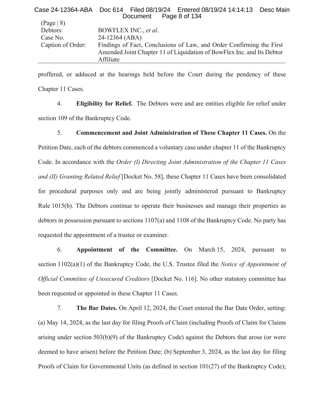 (Page | 8) Debtors: BOWFLEX INC., et al. Case No. 24-12364 (ABA) Caption of Order: Findings of Fact, Conclusions of Law, and Order Confirming the First Amended Joint Chapter 11 of Liquidation of BowFlex Inc. and Its Debtor Affiliate proffered, or adduced at the hearings held before the Court during the pendency of these Chapter 11 Cases. 4. Eligibility for Relief. The Debtors were and are entities eligible for relief under section 109 of the Bankruptcy Code. 5. Commencement and Joint Administration of These Chapter 11 Cases. On the Petition Date, each of the debtors commenced a voluntary case under chapter 11 of the Bankruptcy Code. In accordance with the Order (I) Directing Joint Administration of the Chapter 11 Cases and (II) Granting Related Relief [Docket No. 58], these Chapter 11 Cases have been consolidated for procedural purposes only and are being jointly administered pursuant to Bankruptcy Rule 1015(b). The Debtors continue to operate their businesses and manage their properties as debtors in possession pursuant to sections 1107(a) and 1108 of the Bankruptcy Code. No party has requested the appointment of a trustee or examiner. 6. Appointment of the Committee. On March 15, 2024, pursuant to section 1102(a)(1) of the Bankruptcy Code, the U.S. Trustee filed the Notice of Appointment of Official Committee of Unsecured Creditors [Docket No. 116]. No other statutory committee has been requested or appointed in these Chapter 11 Cases. 7. The Bar Dates. On April 12, 2024, the Court entered the Bar Date Order, setting: (a) May 14, 2024, as the last day for filing Proofs of Claim (including Proofs of Claim for Claims arising under section 503(b)(9) of the Bankruptcy Code) against the Debtors that arose (or were deemed to have arisen) before the Petition Date; (b) September 3, 2024, as the last day for filing Proofs of Claim for Governmental Units (as defined in section 101(27) of the Bankruptcy Code); Case 24-12364-ABA Doc 614 Filed 08/19/24 Entered 08/19/24 14:14:13 Desc Main Document Page 8 of 134