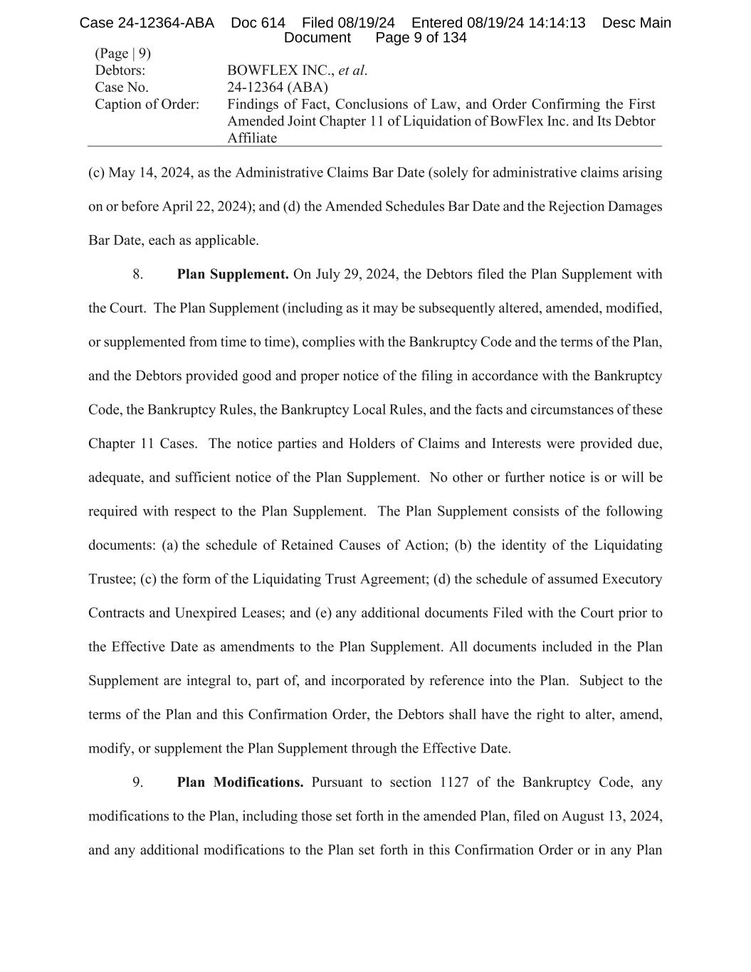 (Page | 9) Debtors: BOWFLEX INC., et al. Case No. 24-12364 (ABA) Caption of Order: Findings of Fact, Conclusions of Law, and Order Confirming the First Amended Joint Chapter 11 of Liquidation of BowFlex Inc. and Its Debtor Affiliate (c) May 14, 2024, as the Administrative Claims Bar Date (solely for administrative claims arising on or before April 22, 2024); and (d) the Amended Schedules Bar Date and the Rejection Damages Bar Date, each as applicable. 8. Plan Supplement. On July 29, 2024, the Debtors filed the Plan Supplement with the Court. The Plan Supplement (including as it may be subsequently altered, amended, modified, or supplemented from time to time), complies with the Bankruptcy Code and the terms of the Plan, and the Debtors provided good and proper notice of the filing in accordance with the Bankruptcy Code, the Bankruptcy Rules, the Bankruptcy Local Rules, and the facts and circumstances of these Chapter 11 Cases. The notice parties and Holders of Claims and Interests were provided due, adequate, and sufficient notice of the Plan Supplement. No other or further notice is or will be required with respect to the Plan Supplement. The Plan Supplement consists of the following documents: (a) the schedule of Retained Causes of Action; (b) the identity of the Liquidating Trustee; (c) the form of the Liquidating Trust Agreement; (d) the schedule of assumed Executory Contracts and Unexpired Leases; and (e) any additional documents Filed with the Court prior to the Effective Date as amendments to the Plan Supplement. All documents included in the Plan Supplement are integral to, part of, and incorporated by reference into the Plan. Subject to the terms of the Plan and this Confirmation Order, the Debtors shall have the right to alter, amend, modify, or supplement the Plan Supplement through the Effective Date. 9. Plan Modifications. Pursuant to section 1127 of the Bankruptcy Code, any modifications to the Plan, including those set forth in the amended Plan, filed on August 13, 2024, and any additional modifications to the Plan set forth in this Confirmation Order or in any Plan Case 24-12364-ABA Doc 614 Filed 08/19/24 Entered 08/19/24 14:14:13 Desc Main Document Page 9 of 134