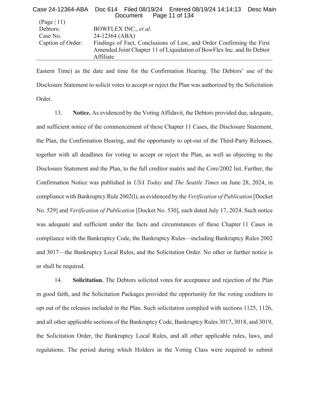 (Page | 11) Debtors: BOWFLEX INC., et al. Case No. 24-12364 (ABA) Caption of Order: Findings of Fact, Conclusions of Law, and Order Confirming the First Amended Joint Chapter 11 of Liquidation of BowFlex Inc. and Its Debtor Affiliate Eastern Time) as the date and time for the Confirmation Hearing. The Debtors’ use of the Disclosure Statement to solicit votes to accept or reject the Plan was authorized by the Solicitation Order. 13. Notice. As evidenced by the Voting Affidavit, the Debtors provided due, adequate, and sufficient notice of the commencement of these Chapter 11 Cases, the Disclosure Statement, the Plan, the Confirmation Hearing, and the opportunity to opt-out of the Third-Party Releases, together with all deadlines for voting to accept or reject the Plan, as well as objecting to the Disclosure Statement and the Plan, to the full creditor matrix and the Core/2002 list. Further, the Confirmation Notice was published in USA Today and The Seattle Times on June 28, 2024, in compliance with Bankruptcy Rule 2002(l), as evidenced by the Verification of Publication [Docket No. 529] and Verification of Publication [Docket No. 530], each dated July 17, 2024. Such notice was adequate and sufficient under the facts and circumstances of these Chapter 11 Cases in compliance with the Bankruptcy Code, the Bankruptcy Rules—including Bankruptcy Rules 2002 and 3017—the Bankruptcy Local Rules, and the Solicitation Order. No other or further notice is or shall be required. 14. Solicitation. The Debtors solicited votes for acceptance and rejection of the Plan in good faith, and the Solicitation Packages provided the opportunity for the voting creditors to opt out of the releases included in the Plan. Such solicitation complied with sections 1125, 1126, and all other applicable sections of the Bankruptcy Code, Bankruptcy Rules 3017, 3018, and 3019, the Solicitation Order, the Bankruptcy Local Rules, and all other applicable rules, laws, and regulations. The period during which Holders in the Voting Class were required to submit Case 24-12364-ABA Doc 614 Filed 08/19/24 Entered 08/19/24 14:14:13 Desc Main Document Page 11 of 134