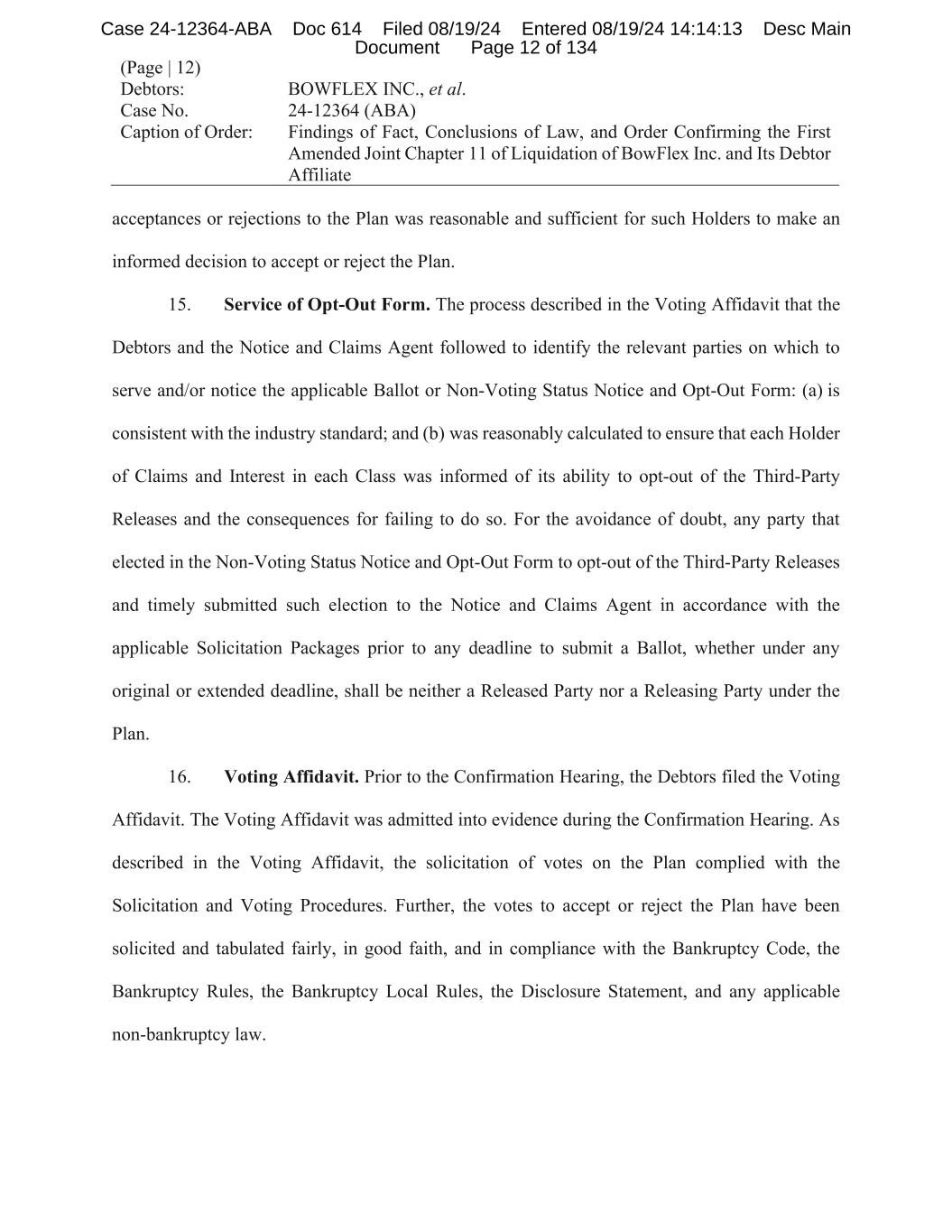 (Page | 12) Debtors: BOWFLEX INC., et al. Case No. 24-12364 (ABA) Caption of Order: Findings of Fact, Conclusions of Law, and Order Confirming the First Amended Joint Chapter 11 of Liquidation of BowFlex Inc. and Its Debtor Affiliate acceptances or rejections to the Plan was reasonable and sufficient for such Holders to make an informed decision to accept or reject the Plan. 15. Service of Opt-Out Form. The process described in the Voting Affidavit that the Debtors and the Notice and Claims Agent followed to identify the relevant parties on which to serve and/or notice the applicable Ballot or Non-Voting Status Notice and Opt-Out Form: (a) is consistent with the industry standard; and (b) was reasonably calculated to ensure that each Holder of Claims and Interest in each Class was informed of its ability to opt-out of the Third-Party Releases and the consequences for failing to do so. For the avoidance of doubt, any party that elected in the Non-Voting Status Notice and Opt-Out Form to opt-out of the Third-Party Releases and timely submitted such election to the Notice and Claims Agent in accordance with the applicable Solicitation Packages prior to any deadline to submit a Ballot, whether under any original or extended deadline, shall be neither a Released Party nor a Releasing Party under the Plan. 16. Voting Affidavit. Prior to the Confirmation Hearing, the Debtors filed the Voting Affidavit. The Voting Affidavit was admitted into evidence during the Confirmation Hearing. As described in the Voting Affidavit, the solicitation of votes on the Plan complied with the Solicitation and Voting Procedures. Further, the votes to accept or reject the Plan have been solicited and tabulated fairly, in good faith, and in compliance with the Bankruptcy Code, the Bankruptcy Rules, the Bankruptcy Local Rules, the Disclosure Statement, and any applicable non-bankruptcy law. Case 24-12364-ABA Doc 614 Filed 08/19/24 Entered 08/19/24 14:14:13 Desc Main Document Page 12 of 134