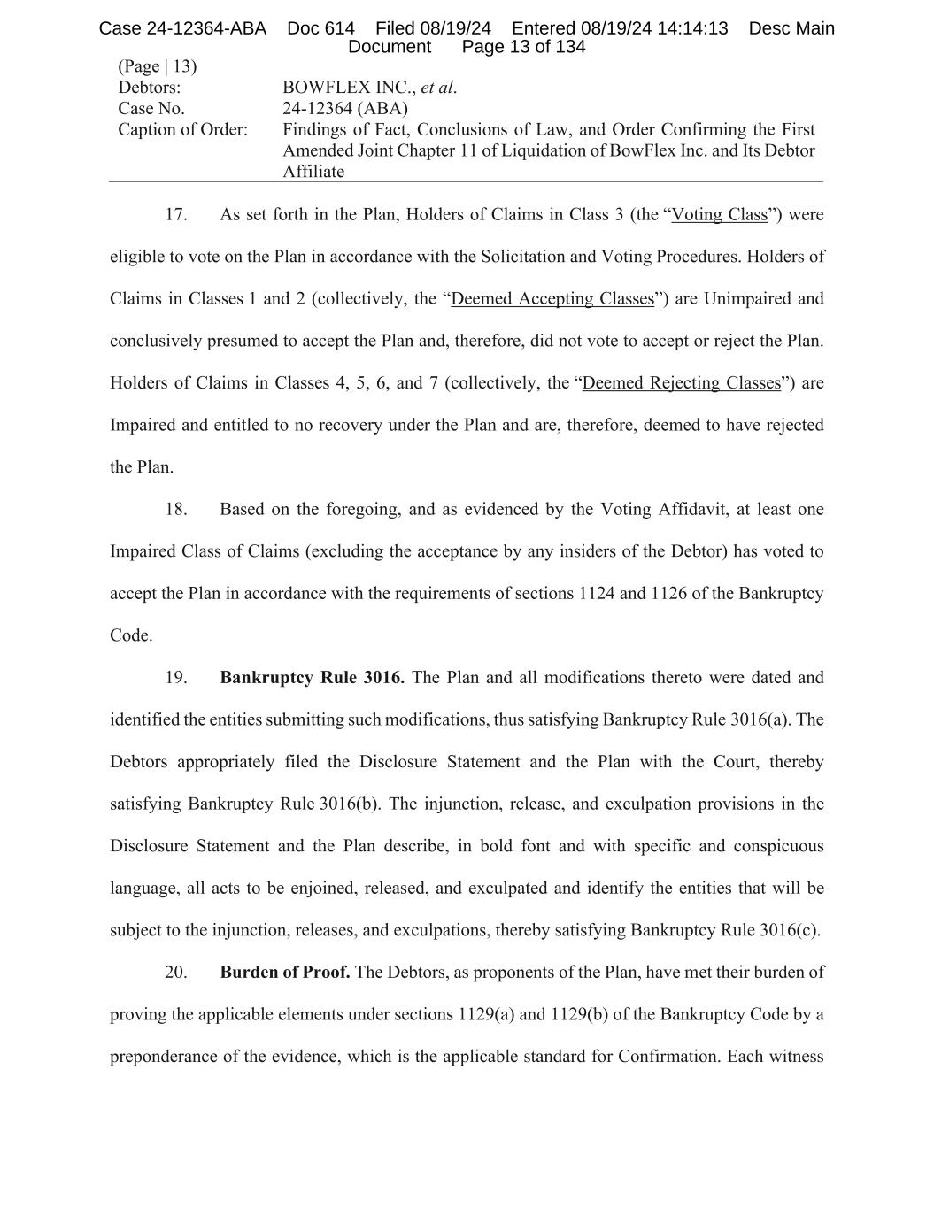 (Page | 13) Debtors: BOWFLEX INC., et al. Case No. 24-12364 (ABA) Caption of Order: Findings of Fact, Conclusions of Law, and Order Confirming the First Amended Joint Chapter 11 of Liquidation of BowFlex Inc. and Its Debtor Affiliate 17. As set forth in the Plan, Holders of Claims in Class 3 (the “Voting Class”) were eligible to vote on the Plan in accordance with the Solicitation and Voting Procedures. Holders of Claims in Classes 1 and 2 (collectively, the “Deemed Accepting Classes”) are Unimpaired and conclusively presumed to accept the Plan and, therefore, did not vote to accept or reject the Plan. Holders of Claims in Classes 4, 5, 6, and 7 (collectively, the “Deemed Rejecting Classes”) are Impaired and entitled to no recovery under the Plan and are, therefore, deemed to have rejected the Plan. 18. Based on the foregoing, and as evidenced by the Voting Affidavit, at least one Impaired Class of Claims (excluding the acceptance by any insiders of the Debtor) has voted to accept the Plan in accordance with the requirements of sections 1124 and 1126 of the Bankruptcy Code. 19. Bankruptcy Rule 3016. The Plan and all modifications thereto were dated and identified the entities submitting such modifications, thus satisfying Bankruptcy Rule 3016(a). The Debtors appropriately filed the Disclosure Statement and the Plan with the Court, thereby satisfying Bankruptcy Rule 3016(b). The injunction, release, and exculpation provisions in the Disclosure Statement and the Plan describe, in bold font and with specific and conspicuous language, all acts to be enjoined, released, and exculpated and identify the entities that will be subject to the injunction, releases, and exculpations, thereby satisfying Bankruptcy Rule 3016(c). 20. Burden of Proof. The Debtors, as proponents of the Plan, have met their burden of proving the applicable elements under sections 1129(a) and 1129(b) of the Bankruptcy Code by a preponderance of the evidence, which is the applicable standard for Confirmation. Each witness Case 24-12364-ABA Doc 614 Filed 08/19/24 Entered 08/19/24 14:14:13 Desc Main Document Page 13 of 134