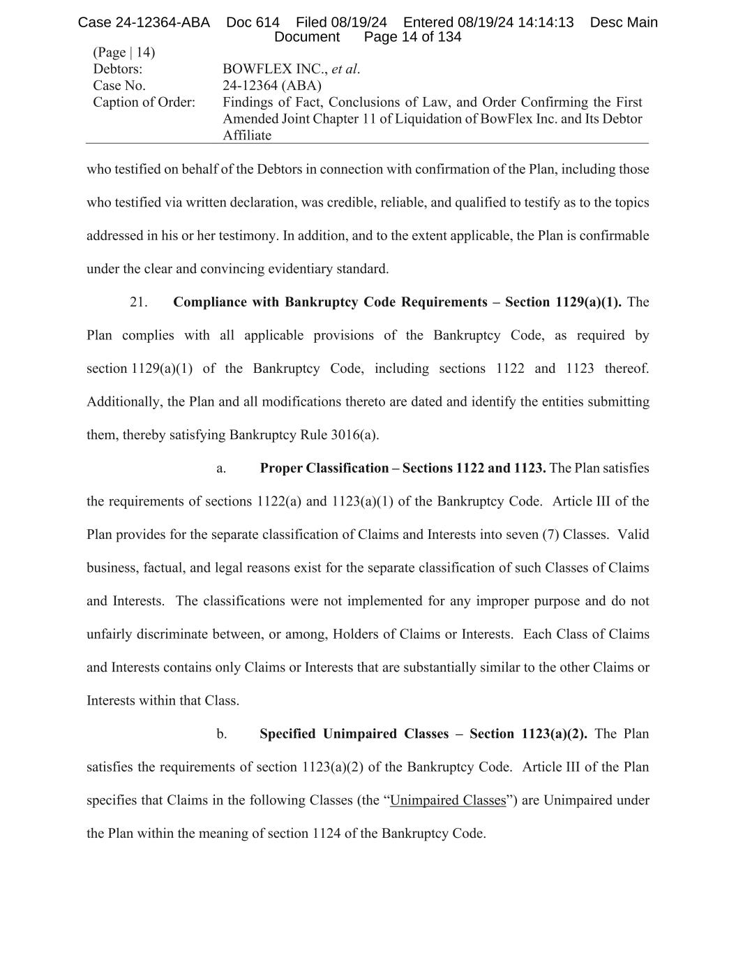 (Page | 14) Debtors: BOWFLEX INC., et al. Case No. 24-12364 (ABA) Caption of Order: Findings of Fact, Conclusions of Law, and Order Confirming the First Amended Joint Chapter 11 of Liquidation of BowFlex Inc. and Its Debtor Affiliate who testified on behalf of the Debtors in connection with confirmation of the Plan, including those who testified via written declaration, was credible, reliable, and qualified to testify as to the topics addressed in his or her testimony. In addition, and to the extent applicable, the Plan is confirmable under the clear and convincing evidentiary standard. 21. Compliance with Bankruptcy Code Requirements – Section 1129(a)(1). The Plan complies with all applicable provisions of the Bankruptcy Code, as required by section 1129(a)(1) of the Bankruptcy Code, including sections 1122 and 1123 thereof. Additionally, the Plan and all modifications thereto are dated and identify the entities submitting them, thereby satisfying Bankruptcy Rule 3016(a). a. Proper Classification – Sections 1122 and 1123. The Plan satisfies the requirements of sections 1122(a) and 1123(a)(1) of the Bankruptcy Code. Article III of the Plan provides for the separate classification of Claims and Interests into seven (7) Classes. Valid business, factual, and legal reasons exist for the separate classification of such Classes of Claims and Interests. The classifications were not implemented for any improper purpose and do not unfairly discriminate between, or among, Holders of Claims or Interests. Each Class of Claims and Interests contains only Claims or Interests that are substantially similar to the other Claims or Interests within that Class. b. Specified Unimpaired Classes – Section 1123(a)(2). The Plan satisfies the requirements of section 1123(a)(2) of the Bankruptcy Code. Article III of the Plan specifies that Claims in the following Classes (the “Unimpaired Classes”) are Unimpaired under the Plan within the meaning of section 1124 of the Bankruptcy Code. Case 24-12364-ABA Doc 614 Filed 08/19/24 Entered 08/19/24 14:14:13 Desc Main Document Page 14 of 134