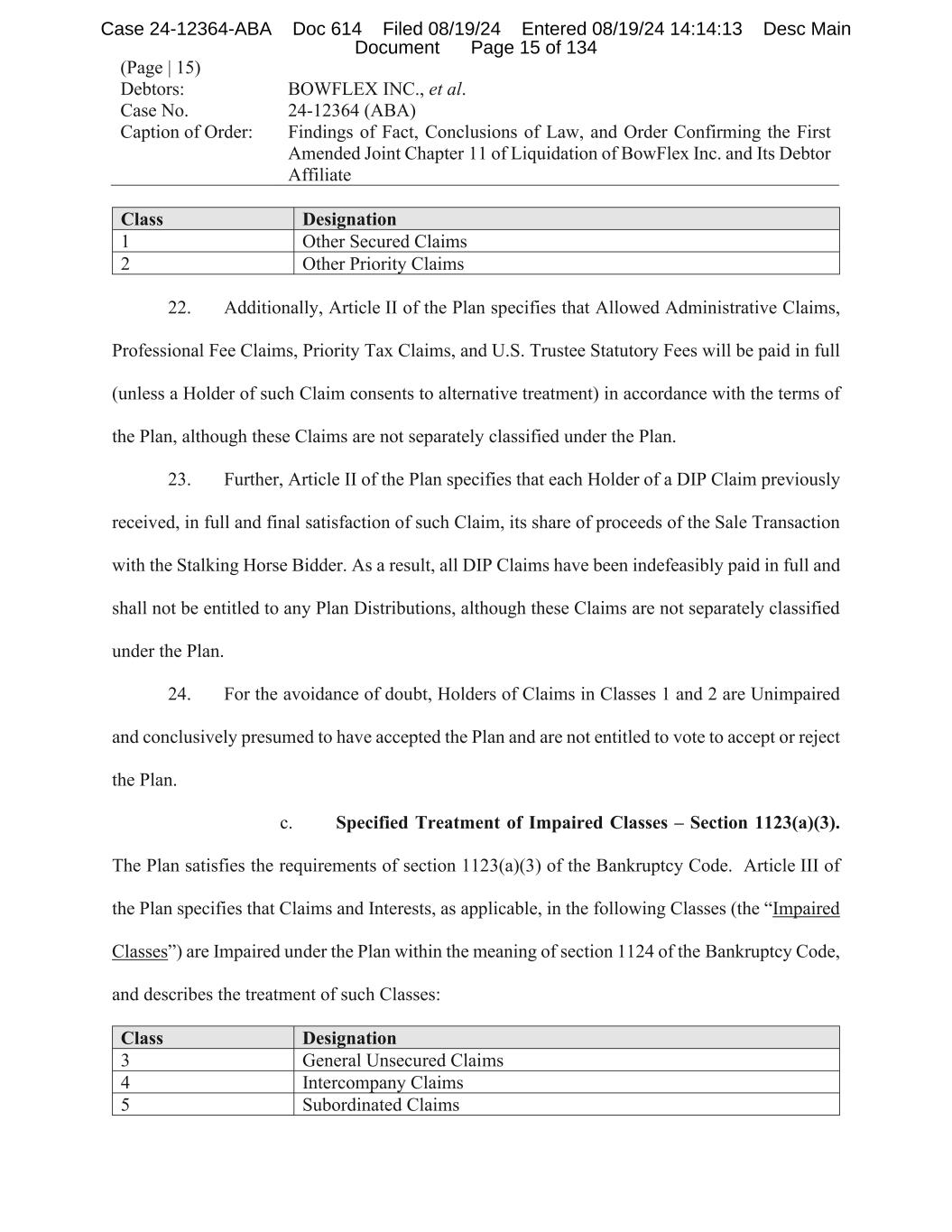 (Page | 15) Debtors: BOWFLEX INC., et al. Case No. 24-12364 (ABA) Caption of Order: Findings of Fact, Conclusions of Law, and Order Confirming the First Amended Joint Chapter 11 of Liquidation of BowFlex Inc. and Its Debtor Affiliate Class Designation 1 Other Secured Claims 2 Other Priority Claims 22. Additionally, Article II of the Plan specifies that Allowed Administrative Claims, Professional Fee Claims, Priority Tax Claims, and U.S. Trustee Statutory Fees will be paid in full (unless a Holder of such Claim consents to alternative treatment) in accordance with the terms of the Plan, although these Claims are not separately classified under the Plan. 23. Further, Article II of the Plan specifies that each Holder of a DIP Claim previously received, in full and final satisfaction of such Claim, its share of proceeds of the Sale Transaction with the Stalking Horse Bidder. As a result, all DIP Claims have been indefeasibly paid in full and shall not be entitled to any Plan Distributions, although these Claims are not separately classified under the Plan. 24. For the avoidance of doubt, Holders of Claims in Classes 1 and 2 are Unimpaired and conclusively presumed to have accepted the Plan and are not entitled to vote to accept or reject the Plan. c. Specified Treatment of Impaired Classes – Section 1123(a)(3). The Plan satisfies the requirements of section 1123(a)(3) of the Bankruptcy Code. Article III of the Plan specifies that Claims and Interests, as applicable, in the following Classes (the “Impaired Classes”) are Impaired under the Plan within the meaning of section 1124 of the Bankruptcy Code, and describes the treatment of such Classes: Class Designation 3 General Unsecured Claims 4 Intercompany Claims 5 Subordinated Claims Case 24-12364-ABA Doc 614 Filed 08/19/24 Entered 08/19/24 14:14:13 Desc Main Document Page 15 of 134