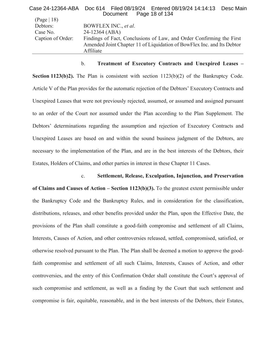 (Page | 18) Debtors: BOWFLEX INC., et al. Case No. 24-12364 (ABA) Caption of Order: Findings of Fact, Conclusions of Law, and Order Confirming the First Amended Joint Chapter 11 of Liquidation of BowFlex Inc. and Its Debtor Affiliate b. Treatment of Executory Contracts and Unexpired Leases – Section 1123(b)2). The Plan is consistent with section 1123(b)(2) of the Bankruptcy Code. Article V of the Plan provides for the automatic rejection of the Debtors’ Executory Contracts and Unexpired Leases that were not previously rejected, assumed, or assumed and assigned pursuant to an order of the Court nor assumed under the Plan according to the Plan Supplement. The Debtors’ determinations regarding the assumption and rejection of Executory Contracts and Unexpired Leases are based on and within the sound business judgment of the Debtors, are necessary to the implementation of the Plan, and are in the best interests of the Debtors, their Estates, Holders of Claims, and other parties in interest in these Chapter 11 Cases. c. Settlement, Release, Exculpation, Injunction, and Preservation of Claims and Causes of Action – Section 1123(b)(3). To the greatest extent permissible under the Bankruptcy Code and the Bankruptcy Rules, and in consideration for the classification, distributions, releases, and other benefits provided under the Plan, upon the Effective Date, the provisions of the Plan shall constitute a good-faith compromise and settlement of all Claims, Interests, Causes of Action, and other controversies released, settled, compromised, satisfied, or otherwise resolved pursuant to the Plan. The Plan shall be deemed a motion to approve the good- faith compromise and settlement of all such Claims, Interests, Causes of Action, and other controversies, and the entry of this Confirmation Order shall constitute the Court’s approval of such compromise and settlement, as well as a finding by the Court that such settlement and compromise is fair, equitable, reasonable, and in the best interests of the Debtors, their Estates, Case 24-12364-ABA Doc 614 Filed 08/19/24 Entered 08/19/24 14:14:13 Desc Main Document Page 18 of 134