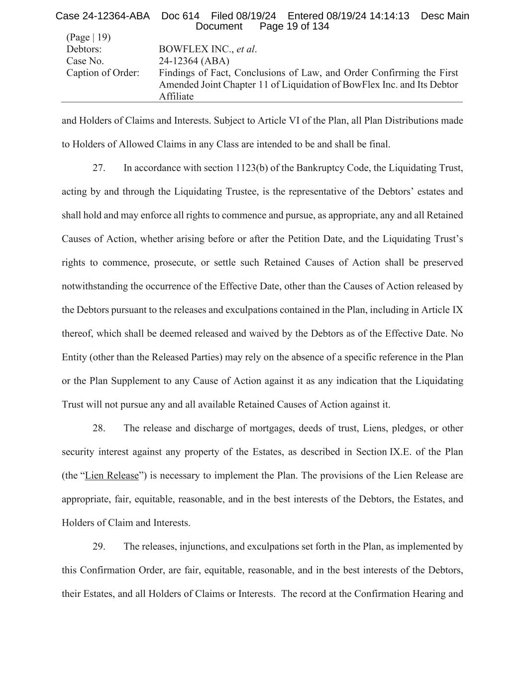 (Page | 19) Debtors: BOWFLEX INC., et al. Case No. 24-12364 (ABA) Caption of Order: Findings of Fact, Conclusions of Law, and Order Confirming the First Amended Joint Chapter 11 of Liquidation of BowFlex Inc. and Its Debtor Affiliate and Holders of Claims and Interests. Subject to Article VI of the Plan, all Plan Distributions made to Holders of Allowed Claims in any Class are intended to be and shall be final. 27. In accordance with section 1123(b) of the Bankruptcy Code, the Liquidating Trust, acting by and through the Liquidating Trustee, is the representative of the Debtors’ estates and shall hold and may enforce all rights to commence and pursue, as appropriate, any and all Retained Causes of Action, whether arising before or after the Petition Date, and the Liquidating Trust’s rights to commence, prosecute, or settle such Retained Causes of Action shall be preserved notwithstanding the occurrence of the Effective Date, other than the Causes of Action released by the Debtors pursuant to the releases and exculpations contained in the Plan, including in Article IX thereof, which shall be deemed released and waived by the Debtors as of the Effective Date. No Entity (other than the Released Parties) may rely on the absence of a specific reference in the Plan or the Plan Supplement to any Cause of Action against it as any indication that the Liquidating Trust will not pursue any and all available Retained Causes of Action against it. 28. The release and discharge of mortgages, deeds of trust, Liens, pledges, or other security interest against any property of the Estates, as described in Section IX.E. of the Plan (the “Lien Release”) is necessary to implement the Plan. The provisions of the Lien Release are appropriate, fair, equitable, reasonable, and in the best interests of the Debtors, the Estates, and Holders of Claim and Interests. 29. The releases, injunctions, and exculpations set forth in the Plan, as implemented by this Confirmation Order, are fair, equitable, reasonable, and in the best interests of the Debtors, their Estates, and all Holders of Claims or Interests. The record at the Confirmation Hearing and Case 24-12364-ABA Doc 614 Filed 08/19/24 Entered 08/19/24 14:14:13 Desc Main Document Page 19 of 134