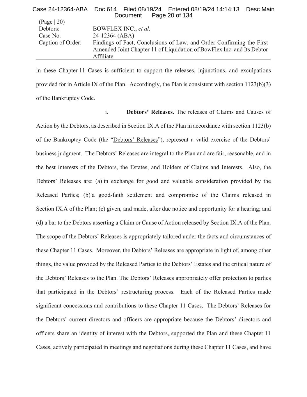 (Page | 20) Debtors: BOWFLEX INC., et al. Case No. 24-12364 (ABA) Caption of Order: Findings of Fact, Conclusions of Law, and Order Confirming the First Amended Joint Chapter 11 of Liquidation of BowFlex Inc. and Its Debtor Affiliate in these Chapter 11 Cases is sufficient to support the releases, injunctions, and exculpations provided for in Article IX of the Plan. Accordingly, the Plan is consistent with section 1123(b)(3) of the Bankruptcy Code. i. Debtors’ Releases. The releases of Claims and Causes of Action by the Debtors, as described in Section IX.A of the Plan in accordance with section 1123(b) of the Bankruptcy Code (the “Debtors’ Releases”), represent a valid exercise of the Debtors’ business judgment. The Debtors’ Releases are integral to the Plan and are fair, reasonable, and in the best interests of the Debtors, the Estates, and Holders of Claims and Interests. Also, the Debtors’ Releases are: (a) in exchange for good and valuable consideration provided by the Released Parties; (b) a good-faith settlement and compromise of the Claims released in Section IX.A of the Plan; (c) given, and made, after due notice and opportunity for a hearing; and (d) a bar to the Debtors asserting a Claim or Cause of Action released by Section IX.A of the Plan. The scope of the Debtors’ Releases is appropriately tailored under the facts and circumstances of these Chapter 11 Cases. Moreover, the Debtors’ Releases are appropriate in light of, among other things, the value provided by the Released Parties to the Debtors’ Estates and the critical nature of the Debtors’ Releases to the Plan. The Debtors’ Releases appropriately offer protection to parties that participated in the Debtors’ restructuring process. Each of the Released Parties made significant concessions and contributions to these Chapter 11 Cases. The Debtors’ Releases for the Debtors’ current directors and officers are appropriate because the Debtors’ directors and officers share an identity of interest with the Debtors, supported the Plan and these Chapter 11 Cases, actively participated in meetings and negotiations during these Chapter 11 Cases, and have Case 24-12364-ABA Doc 614 Filed 08/19/24 Entered 08/19/24 14:14:13 Desc Main Document Page 20 of 134