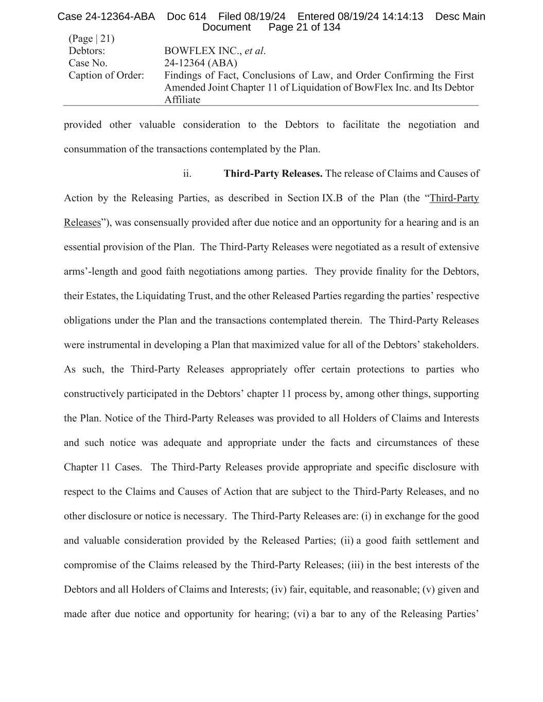 (Page | 21) Debtors: BOWFLEX INC., et al. Case No. 24-12364 (ABA) Caption of Order: Findings of Fact, Conclusions of Law, and Order Confirming the First Amended Joint Chapter 11 of Liquidation of BowFlex Inc. and Its Debtor Affiliate provided other valuable consideration to the Debtors to facilitate the negotiation and consummation of the transactions contemplated by the Plan. ii. Third-Party Releases. The release of Claims and Causes of Action by the Releasing Parties, as described in Section IX.B of the Plan (the “Third-Party Releases”), was consensually provided after due notice and an opportunity for a hearing and is an essential provision of the Plan. The Third-Party Releases were negotiated as a result of extensive arms’-length and good faith negotiations among parties. They provide finality for the Debtors, their Estates, the Liquidating Trust, and the other Released Parties regarding the parties’ respective obligations under the Plan and the transactions contemplated therein. The Third-Party Releases were instrumental in developing a Plan that maximized value for all of the Debtors’ stakeholders. As such, the Third-Party Releases appropriately offer certain protections to parties who constructively participated in the Debtors’ chapter 11 process by, among other things, supporting the Plan. Notice of the Third-Party Releases was provided to all Holders of Claims and Interests and such notice was adequate and appropriate under the facts and circumstances of these Chapter 11 Cases. The Third-Party Releases provide appropriate and specific disclosure with respect to the Claims and Causes of Action that are subject to the Third-Party Releases, and no other disclosure or notice is necessary. The Third-Party Releases are: (i) in exchange for the good and valuable consideration provided by the Released Parties; (ii) a good faith settlement and compromise of the Claims released by the Third-Party Releases; (iii) in the best interests of the Debtors and all Holders of Claims and Interests; (iv) fair, equitable, and reasonable; (v) given and made after due notice and opportunity for hearing; (vi) a bar to any of the Releasing Parties’ Case 24-12364-ABA Doc 614 Filed 08/19/24 Entered 08/19/24 14:14:13 Desc Main Document Page 21 of 134