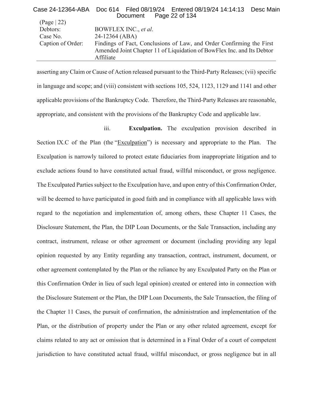 (Page | 22) Debtors: BOWFLEX INC., et al. Case No. 24-12364 (ABA) Caption of Order: Findings of Fact, Conclusions of Law, and Order Confirming the First Amended Joint Chapter 11 of Liquidation of BowFlex Inc. and Its Debtor Affiliate asserting any Claim or Cause of Action released pursuant to the Third-Party Releases; (vii) specific in language and scope; and (viii) consistent with sections 105, 524, 1123, 1129 and 1141 and other applicable provisions of the Bankruptcy Code. Therefore, the Third-Party Releases are reasonable, appropriate, and consistent with the provisions of the Bankruptcy Code and applicable law. iii. Exculpation. The exculpation provision described in Section IX.C of the Plan (the “Exculpation”) is necessary and appropriate to the Plan. The Exculpation is narrowly tailored to protect estate fiduciaries from inappropriate litigation and to exclude actions found to have constituted actual fraud, willful misconduct, or gross negligence. The Exculpated Parties subject to the Exculpation have, and upon entry of this Confirmation Order, will be deemed to have participated in good faith and in compliance with all applicable laws with regard to the negotiation and implementation of, among others, these Chapter 11 Cases, the Disclosure Statement, the Plan, the DIP Loan Documents, or the Sale Transaction, including any contract, instrument, release or other agreement or document (including providing any legal opinion requested by any Entity regarding any transaction, contract, instrument, document, or other agreement contemplated by the Plan or the reliance by any Exculpated Party on the Plan or this Confirmation Order in lieu of such legal opinion) created or entered into in connection with the Disclosure Statement or the Plan, the DIP Loan Documents, the Sale Transaction, the filing of the Chapter 11 Cases, the pursuit of confirmation, the administration and implementation of the Plan, or the distribution of property under the Plan or any other related agreement, except for claims related to any act or omission that is determined in a Final Order of a court of competent jurisdiction to have constituted actual fraud, willful misconduct, or gross negligence but in all Case 24-12364-ABA Doc 614 Filed 08/19/24 Entered 08/19/24 14:14:13 Desc Main Document Page 22 of 134