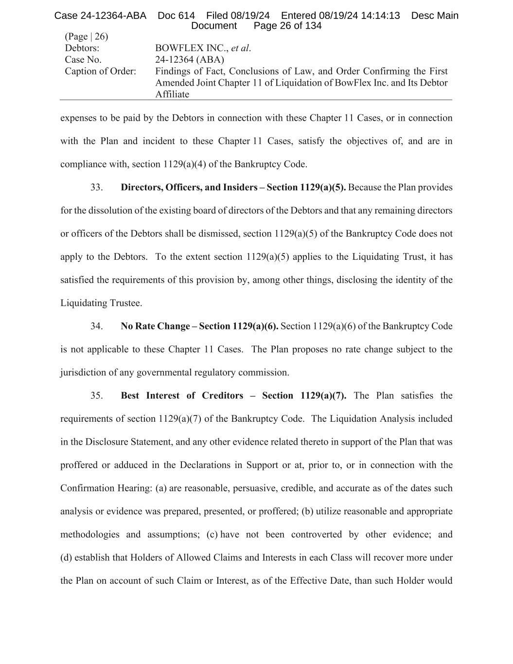 (Page | 26) Debtors: BOWFLEX INC., et al. Case No. 24-12364 (ABA) Caption of Order: Findings of Fact, Conclusions of Law, and Order Confirming the First Amended Joint Chapter 11 of Liquidation of BowFlex Inc. and Its Debtor Affiliate expenses to be paid by the Debtors in connection with these Chapter 11 Cases, or in connection with the Plan and incident to these Chapter 11 Cases, satisfy the objectives of, and are in compliance with, section 1129(a)(4) of the Bankruptcy Code. 33. Directors, Officers, and Insiders – Section 1129(a)(5). Because the Plan provides for the dissolution of the existing board of directors of the Debtors and that any remaining directors or officers of the Debtors shall be dismissed, section 1129(a)(5) of the Bankruptcy Code does not apply to the Debtors. To the extent section 1129(a)(5) applies to the Liquidating Trust, it has satisfied the requirements of this provision by, among other things, disclosing the identity of the Liquidating Trustee. 34. No Rate Change – Section 1129(a)(6). Section 1129(a)(6) of the Bankruptcy Code is not applicable to these Chapter 11 Cases. The Plan proposes no rate change subject to the jurisdiction of any governmental regulatory commission. 35. Best Interest of Creditors – Section 1129(a)(7). The Plan satisfies the requirements of section 1129(a)(7) of the Bankruptcy Code. The Liquidation Analysis included in the Disclosure Statement, and any other evidence related thereto in support of the Plan that was proffered or adduced in the Declarations in Support or at, prior to, or in connection with the Confirmation Hearing: (a) are reasonable, persuasive, credible, and accurate as of the dates such analysis or evidence was prepared, presented, or proffered; (b) utilize reasonable and appropriate methodologies and assumptions; (c) have not been controverted by other evidence; and (d) establish that Holders of Allowed Claims and Interests in each Class will recover more under the Plan on account of such Claim or Interest, as of the Effective Date, than such Holder would Case 24-12364-ABA Doc 614 Filed 08/19/24 Entered 08/19/24 14:14:13 Desc Main Document Page 26 of 134