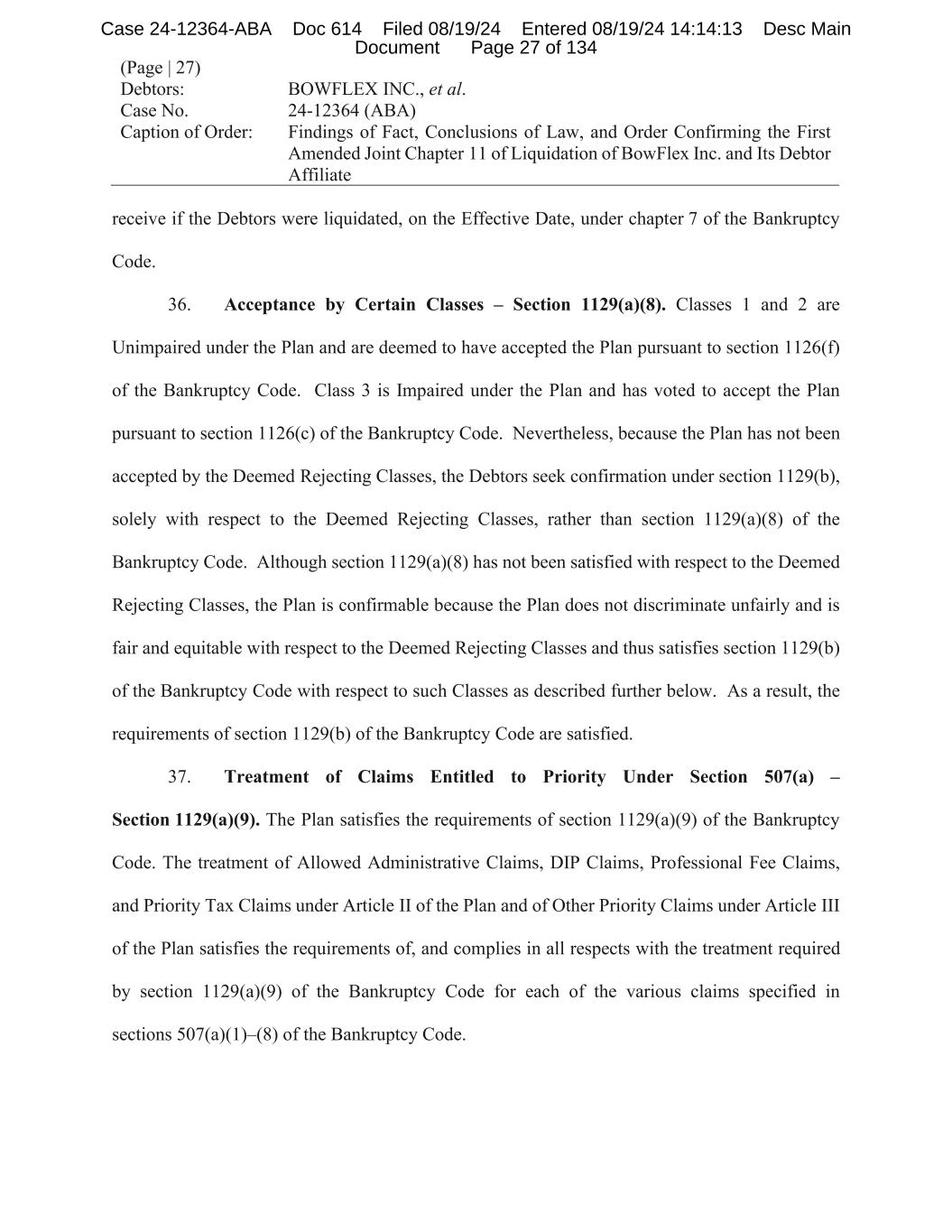 (Page | 27) Debtors: BOWFLEX INC., et al. Case No. 24-12364 (ABA) Caption of Order: Findings of Fact, Conclusions of Law, and Order Confirming the First Amended Joint Chapter 11 of Liquidation of BowFlex Inc. and Its Debtor Affiliate receive if the Debtors were liquidated, on the Effective Date, under chapter 7 of the Bankruptcy Code. 36. Acceptance by Certain Classes – Section 1129(a)(8). Classes 1 and 2 are Unimpaired under the Plan and are deemed to have accepted the Plan pursuant to section 1126(f) of the Bankruptcy Code. Class 3 is Impaired under the Plan and has voted to accept the Plan pursuant to section 1126(c) of the Bankruptcy Code. Nevertheless, because the Plan has not been accepted by the Deemed Rejecting Classes, the Debtors seek confirmation under section 1129(b), solely with respect to the Deemed Rejecting Classes, rather than section 1129(a)(8) of the Bankruptcy Code. Although section 1129(a)(8) has not been satisfied with respect to the Deemed Rejecting Classes, the Plan is confirmable because the Plan does not discriminate unfairly and is fair and equitable with respect to the Deemed Rejecting Classes and thus satisfies section 1129(b) of the Bankruptcy Code with respect to such Classes as described further below. As a result, the requirements of section 1129(b) of the Bankruptcy Code are satisfied. 37. Treatment of Claims Entitled to Priority Under Section 507(a) – Section 1129(a)(9). The Plan satisfies the requirements of section 1129(a)(9) of the Bankruptcy Code. The treatment of Allowed Administrative Claims, DIP Claims, Professional Fee Claims, and Priority Tax Claims under Article II of the Plan and of Other Priority Claims under Article III of the Plan satisfies the requirements of, and complies in all respects with the treatment required by section 1129(a)(9) of the Bankruptcy Code for each of the various claims specified in sections 507(a)(1)–(8) of the Bankruptcy Code. Case 24-12364-ABA Doc 614 Filed 08/19/24 Entered 08/19/24 14:14:13 Desc Main Document Page 27 of 134