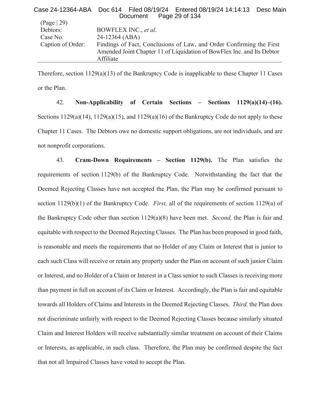 (Page | 29) Debtors: BOWFLEX INC., et al. Case No. 24-12364 (ABA) Caption of Order: Findings of Fact, Conclusions of Law, and Order Confirming the First Amended Joint Chapter 11 of Liquidation of BowFlex Inc. and Its Debtor Affiliate Therefore, section 1129(a)(13) of the Bankruptcy Code is inapplicable to these Chapter 11 Cases or the Plan. 42. Non-Applicability of Certain Sections – Sections 1129(a)(14)–(16). Sections 1129(a)(14), 1129(a)(15), and 1129(a)(16) of the Bankruptcy Code do not apply to these Chapter 11 Cases. The Debtors owe no domestic support obligations, are not individuals, and are not nonprofit corporations. 43. Cram-Down Requirements – Section 1129(b). The Plan satisfies the requirements of section 1129(b) of the Bankruptcy Code. Notwithstanding the fact that the Deemed Rejecting Classes have not accepted the Plan, the Plan may be confirmed pursuant to section 1129(b)(1) of the Bankruptcy Code. First, all of the requirements of section 1129(a) of the Bankruptcy Code other than section 1129(a)(8) have been met. Second, the Plan is fair and equitable with respect to the Deemed Rejecting Classes. The Plan has been proposed in good faith, is reasonable and meets the requirements that no Holder of any Claim or Interest that is junior to each such Class will receive or retain any property under the Plan on account of such junior Claim or Interest, and no Holder of a Claim or Interest in a Class senior to such Classes is receiving more than payment in full on account of its Claim or Interest. Accordingly, the Plan is fair and equitable towards all Holders of Claims and Interests in the Deemed Rejecting Classes. Third, the Plan does not discriminate unfairly with respect to the Deemed Rejecting Classes because similarly situated Claim and Interest Holders will receive substantially similar treatment on account of their Claims or Interests, as applicable, in such class. Therefore, the Plan may be confirmed despite the fact that not all Impaired Classes have voted to accept the Plan. Case 24-12364-ABA Doc 614 Filed 08/19/24 Entered 08/19/24 14:14:13 Desc Main Document Page 29 of 134