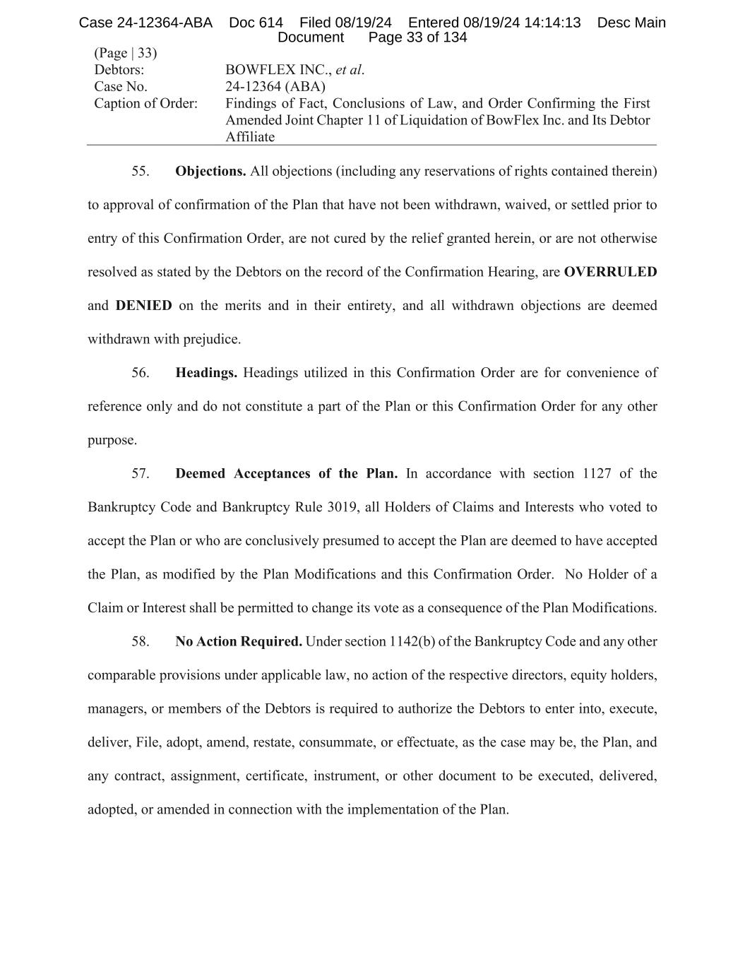 (Page | 33) Debtors: BOWFLEX INC., et al. Case No. 24-12364 (ABA) Caption of Order: Findings of Fact, Conclusions of Law, and Order Confirming the First Amended Joint Chapter 11 of Liquidation of BowFlex Inc. and Its Debtor Affiliate 55. Objections. All objections (including any reservations of rights contained therein) to approval of confirmation of the Plan that have not been withdrawn, waived, or settled prior to entry of this Confirmation Order, are not cured by the relief granted herein, or are not otherwise resolved as stated by the Debtors on the record of the Confirmation Hearing, are OVERRULED and DENIED on the merits and in their entirety, and all withdrawn objections are deemed withdrawn with prejudice. 56. Headings. Headings utilized in this Confirmation Order are for convenience of reference only and do not constitute a part of the Plan or this Confirmation Order for any other purpose. 57. Deemed Acceptances of the Plan. In accordance with section 1127 of the Bankruptcy Code and Bankruptcy Rule 3019, all Holders of Claims and Interests who voted to accept the Plan or who are conclusively presumed to accept the Plan are deemed to have accepted the Plan, as modified by the Plan Modifications and this Confirmation Order. No Holder of a Claim or Interest shall be permitted to change its vote as a consequence of the Plan Modifications. 58. No Action Required. Under section 1142(b) of the Bankruptcy Code and any other comparable provisions under applicable law, no action of the respective directors, equity holders, managers, or members of the Debtors is required to authorize the Debtors to enter into, execute, deliver, File, adopt, amend, restate, consummate, or effectuate, as the case may be, the Plan, and any contract, assignment, certificate, instrument, or other document to be executed, delivered, adopted, or amended in connection with the implementation of the Plan. Case 24-12364-ABA Doc 614 Filed 08/19/24 Entered 08/19/24 14:14:13 Desc Main Document Page 33 of 134