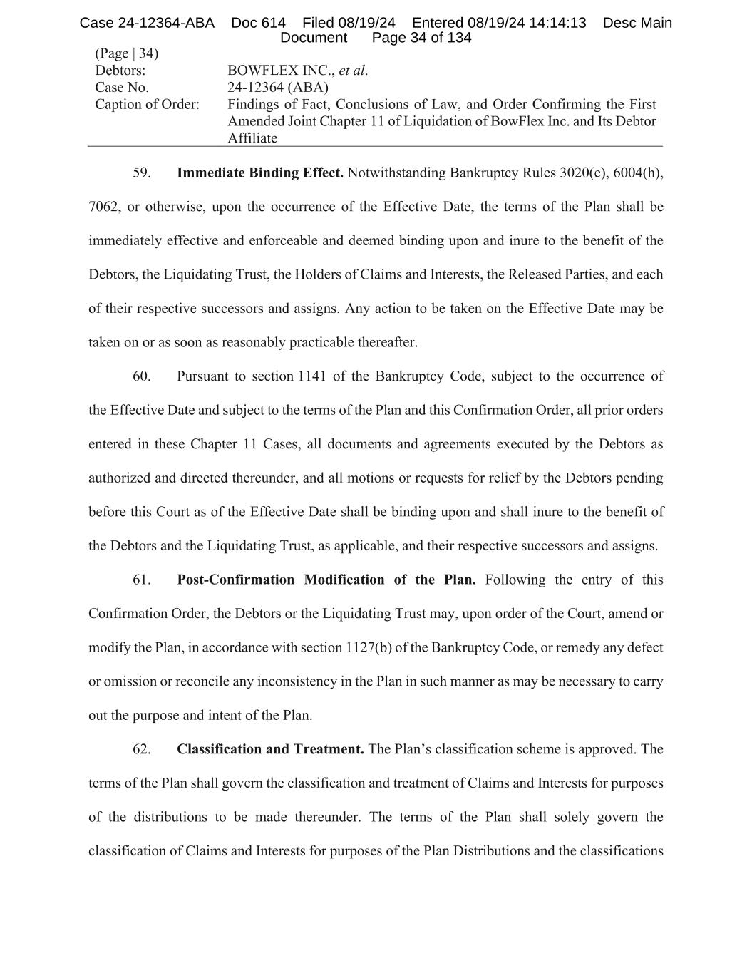 (Page | 34) Debtors: BOWFLEX INC., et al. Case No. 24-12364 (ABA) Caption of Order: Findings of Fact, Conclusions of Law, and Order Confirming the First Amended Joint Chapter 11 of Liquidation of BowFlex Inc. and Its Debtor Affiliate 59. Immediate Binding Effect. Notwithstanding Bankruptcy Rules 3020(e), 6004(h), 7062, or otherwise, upon the occurrence of the Effective Date, the terms of the Plan shall be immediately effective and enforceable and deemed binding upon and inure to the benefit of the Debtors, the Liquidating Trust, the Holders of Claims and Interests, the Released Parties, and each of their respective successors and assigns. Any action to be taken on the Effective Date may be taken on or as soon as reasonably practicable thereafter. 60. Pursuant to section 1141 of the Bankruptcy Code, subject to the occurrence of the Effective Date and subject to the terms of the Plan and this Confirmation Order, all prior orders entered in these Chapter 11 Cases, all documents and agreements executed by the Debtors as authorized and directed thereunder, and all motions or requests for relief by the Debtors pending before this Court as of the Effective Date shall be binding upon and shall inure to the benefit of the Debtors and the Liquidating Trust, as applicable, and their respective successors and assigns. 61. Post-Confirmation Modification of the Plan. Following the entry of this Confirmation Order, the Debtors or the Liquidating Trust may, upon order of the Court, amend or modify the Plan, in accordance with section 1127(b) of the Bankruptcy Code, or remedy any defect or omission or reconcile any inconsistency in the Plan in such manner as may be necessary to carry out the purpose and intent of the Plan. 62. Classification and Treatment. The Plan’s classification scheme is approved. The terms of the Plan shall govern the classification and treatment of Claims and Interests for purposes of the distributions to be made thereunder. The terms of the Plan shall solely govern the classification of Claims and Interests for purposes of the Plan Distributions and the classifications Case 24-12364-ABA Doc 614 Filed 08/19/24 Entered 08/19/24 14:14:13 Desc Main Document Page 34 of 134