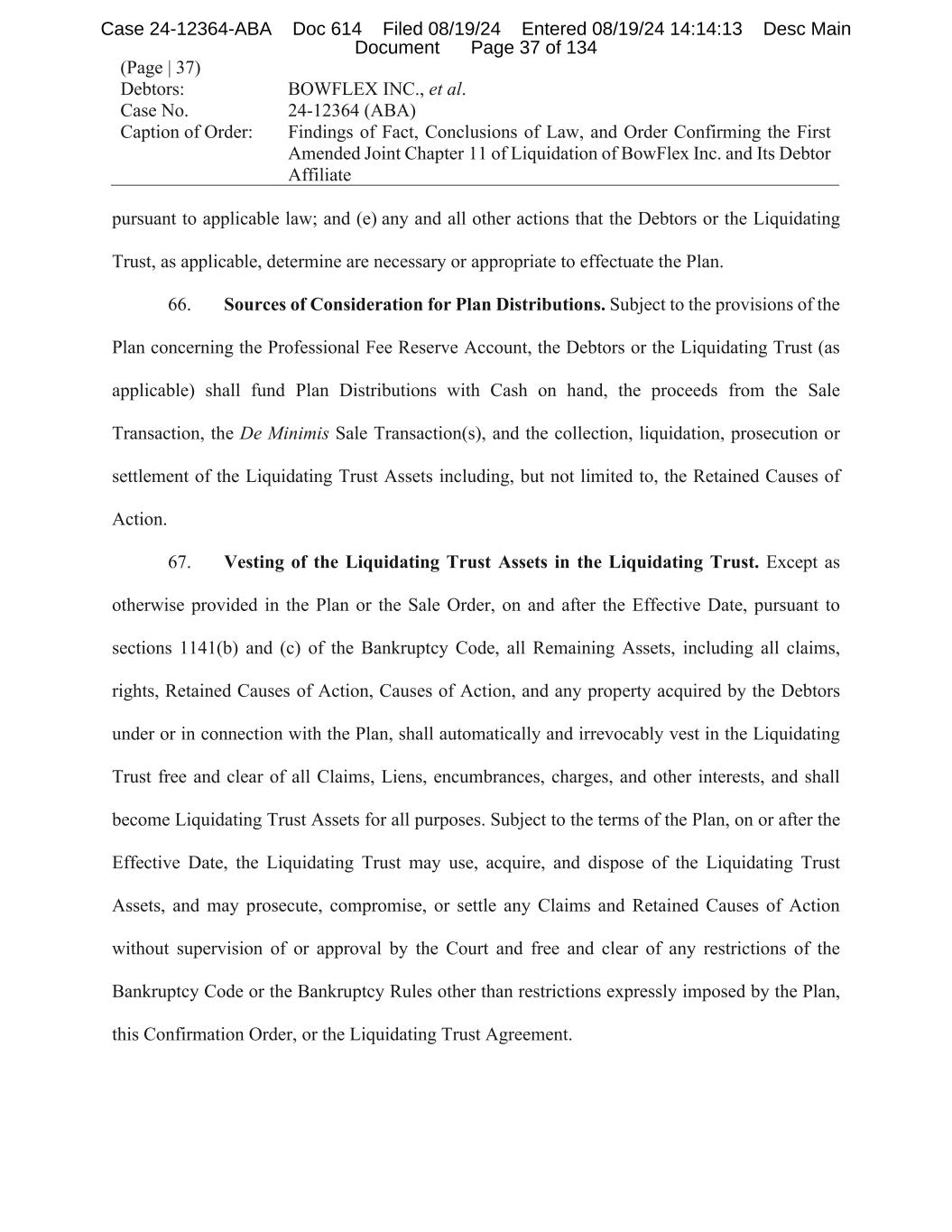 (Page | 37) Debtors: BOWFLEX INC., et al. Case No. 24-12364 (ABA) Caption of Order: Findings of Fact, Conclusions of Law, and Order Confirming the First Amended Joint Chapter 11 of Liquidation of BowFlex Inc. and Its Debtor Affiliate pursuant to applicable law; and (e) any and all other actions that the Debtors or the Liquidating Trust, as applicable, determine are necessary or appropriate to effectuate the Plan. 66. Sources of Consideration for Plan Distributions. Subject to the provisions of the Plan concerning the Professional Fee Reserve Account, the Debtors or the Liquidating Trust (as applicable) shall fund Plan Distributions with Cash on hand, the proceeds from the Sale Transaction, the De Minimis Sale Transaction(s), and the collection, liquidation, prosecution or settlement of the Liquidating Trust Assets including, but not limited to, the Retained Causes of Action. 67. Vesting of the Liquidating Trust Assets in the Liquidating Trust. Except as otherwise provided in the Plan or the Sale Order, on and after the Effective Date, pursuant to sections 1141(b) and (c) of the Bankruptcy Code, all Remaining Assets, including all claims, rights, Retained Causes of Action, Causes of Action, and any property acquired by the Debtors under or in connection with the Plan, shall automatically and irrevocably vest in the Liquidating Trust free and clear of all Claims, Liens, encumbrances, charges, and other interests, and shall become Liquidating Trust Assets for all purposes. Subject to the terms of the Plan, on or after the Effective Date, the Liquidating Trust may use, acquire, and dispose of the Liquidating Trust Assets, and may prosecute, compromise, or settle any Claims and Retained Causes of Action without supervision of or approval by the Court and free and clear of any restrictions of the Bankruptcy Code or the Bankruptcy Rules other than restrictions expressly imposed by the Plan, this Confirmation Order, or the Liquidating Trust Agreement. Case 24-12364-ABA Doc 614 Filed 08/19/24 Entered 08/19/24 14:14:13 Desc Main Document Page 37 of 134