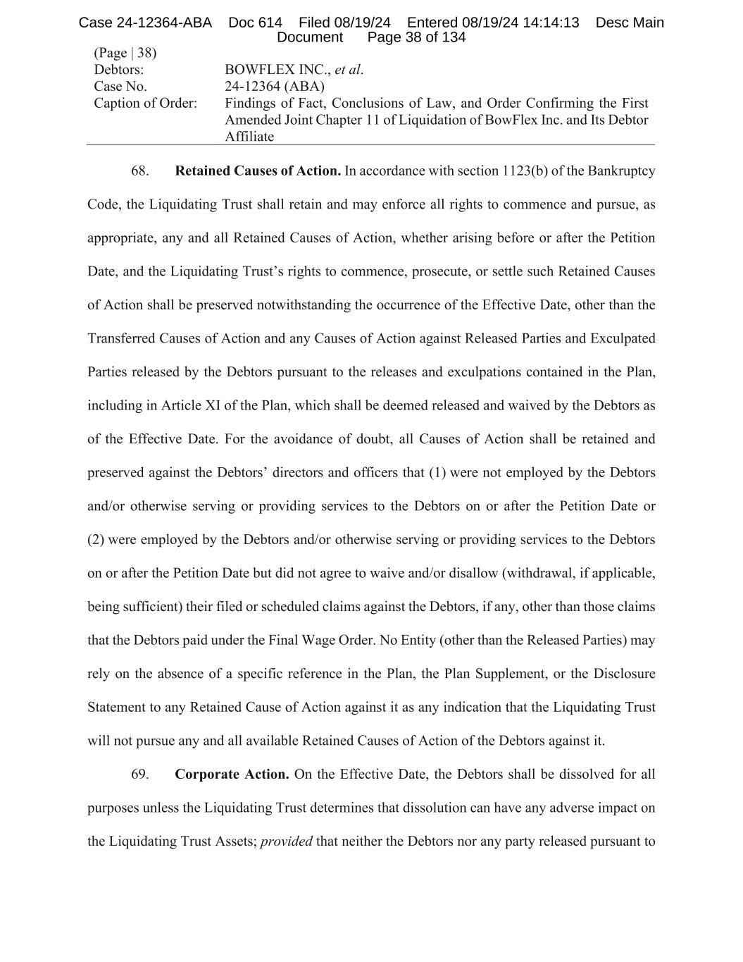(Page | 38) Debtors: BOWFLEX INC., et al. Case No. 24-12364 (ABA) Caption of Order: Findings of Fact, Conclusions of Law, and Order Confirming the First Amended Joint Chapter 11 of Liquidation of BowFlex Inc. and Its Debtor Affiliate 68. Retained Causes of Action. In accordance with section 1123(b) of the Bankruptcy Code, the Liquidating Trust shall retain and may enforce all rights to commence and pursue, as appropriate, any and all Retained Causes of Action, whether arising before or after the Petition Date, and the Liquidating Trust’s rights to commence, prosecute, or settle such Retained Causes of Action shall be preserved notwithstanding the occurrence of the Effective Date, other than the Transferred Causes of Action and any Causes of Action against Released Parties and Exculpated Parties released by the Debtors pursuant to the releases and exculpations contained in the Plan, including in Article XI of the Plan, which shall be deemed released and waived by the Debtors as of the Effective Date. For the avoidance of doubt, all Causes of Action shall be retained and preserved against the Debtors’ directors and officers that (1) were not employed by the Debtors and/or otherwise serving or providing services to the Debtors on or after the Petition Date or (2) were employed by the Debtors and/or otherwise serving or providing services to the Debtors on or after the Petition Date but did not agree to waive and/or disallow (withdrawal, if applicable, being sufficient) their filed or scheduled claims against the Debtors, if any, other than those claims that the Debtors paid under the Final Wage Order. No Entity (other than the Released Parties) may rely on the absence of a specific reference in the Plan, the Plan Supplement, or the Disclosure Statement to any Retained Cause of Action against it as any indication that the Liquidating Trust will not pursue any and all available Retained Causes of Action of the Debtors against it. 69. Corporate Action. On the Effective Date, the Debtors shall be dissolved for all purposes unless the Liquidating Trust determines that dissolution can have any adverse impact on the Liquidating Trust Assets; provided that neither the Debtors nor any party released pursuant to Case 24-12364-ABA Doc 614 Filed 08/19/24 Entered 08/19/24 14:14:13 Desc Main Document Page 38 of 134