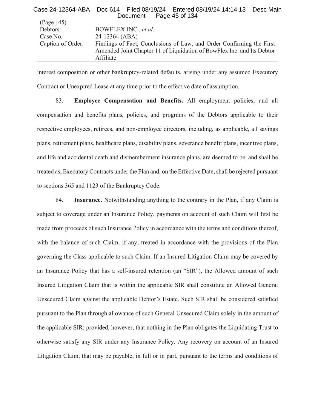 (Page | 45) Debtors: BOWFLEX INC., et al. Case No. 24-12364 (ABA) Caption of Order: Findings of Fact, Conclusions of Law, and Order Confirming the First Amended Joint Chapter 11 of Liquidation of BowFlex Inc. and Its Debtor Affiliate interest composition or other bankruptcy-related defaults, arising under any assumed Executory Contract or Unexpired Lease at any time prior to the effective date of assumption. 83. Employee Compensation and Benefits. All employment policies, and all compensation and benefits plans, policies, and programs of the Debtors applicable to their respective employees, retirees, and non-employee directors, including, as applicable, all savings plans, retirement plans, healthcare plans, disability plans, severance benefit plans, incentive plans, and life and accidental death and dismemberment insurance plans, are deemed to be, and shall be treated as, Executory Contracts under the Plan and, on the Effective Date, shall be rejected pursuant to sections 365 and 1123 of the Bankruptcy Code. 84. Insurance. Notwithstanding anything to the contrary in the Plan, if any Claim is subject to coverage under an Insurance Policy, payments on account of such Claim will first be made from proceeds of such Insurance Policy in accordance with the terms and conditions thereof, with the balance of such Claim, if any, treated in accordance with the provisions of the Plan governing the Class applicable to such Claim. If an Insured Litigation Claim may be covered by an Insurance Policy that has a self-insured retention (an “SIR”), the Allowed amount of such Insured Litigation Claim that is within the applicable SIR shall constitute an Allowed General Unsecured Claim against the applicable Debtor’s Estate. Such SIR shall be considered satisfied pursuant to the Plan through allowance of such General Unsecured Claim solely in the amount of the applicable SIR; provided, however, that nothing in the Plan obligates the Liquidating Trust to otherwise satisfy any SIR under any Insurance Policy. Any recovery on account of an Insured Litigation Claim, that may be payable, in full or in part, pursuant to the terms and conditions of Case 24-12364-ABA Doc 614 Filed 08/19/24 Entered 08/19/24 14:14:13 Desc Main Document Page 45 of 134