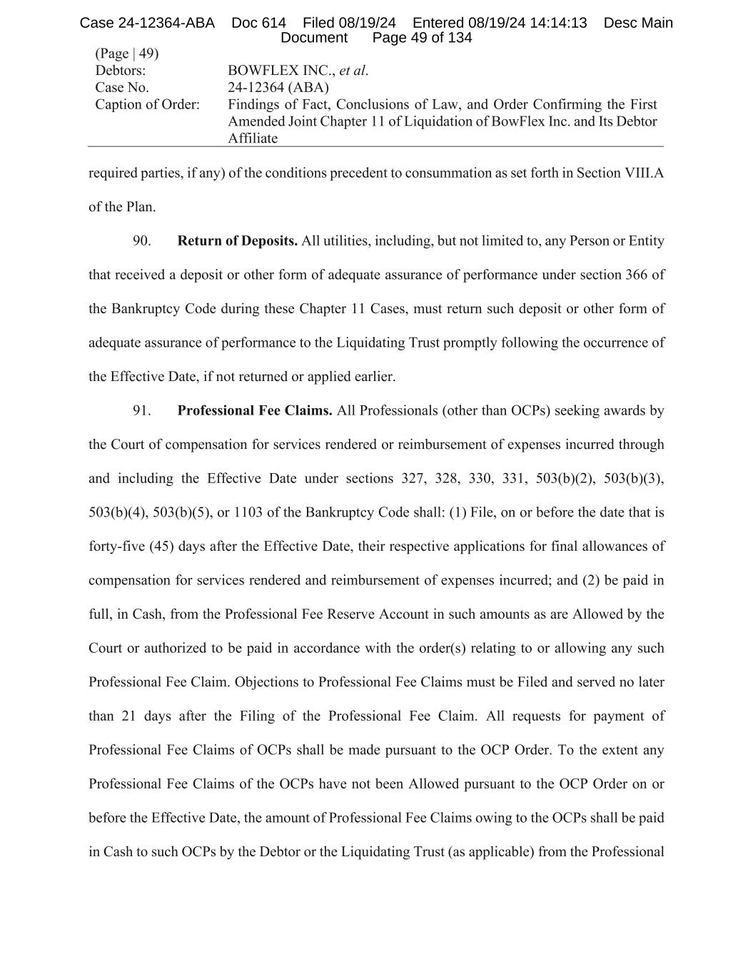 (Page | 49) Debtors: BOWFLEX INC., et al. Case No. 24-12364 (ABA) Caption of Order: Findings of Fact, Conclusions of Law, and Order Confirming the First Amended Joint Chapter 11 of Liquidation of BowFlex Inc. and Its Debtor Affiliate required parties, if any) of the conditions precedent to consummation as set forth in Section VIII.A of the Plan. 90. Return of Deposits. All utilities, including, but not limited to, any Person or Entity that received a deposit or other form of adequate assurance of performance under section 366 of the Bankruptcy Code during these Chapter 11 Cases, must return such deposit or other form of adequate assurance of performance to the Liquidating Trust promptly following the occurrence of the Effective Date, if not returned or applied earlier. 91. Professional Fee Claims. All Professionals (other than OCPs) seeking awards by the Court of compensation for services rendered or reimbursement of expenses incurred through and including the Effective Date under sections 327, 328, 330, 331, 503(b)(2), 503(b)(3), 503(b)(4), 503(b)(5), or 1103 of the Bankruptcy Code shall: (1) File, on or before the date that is forty-five (45) days after the Effective Date, their respective applications for final allowances of compensation for services rendered and reimbursement of expenses incurred; and (2) be paid in full, in Cash, from the Professional Fee Reserve Account in such amounts as are Allowed by the Court or authorized to be paid in accordance with the order(s) relating to or allowing any such Professional Fee Claim. Objections to Professional Fee Claims must be Filed and served no later than 21 days after the Filing of the Professional Fee Claim. All requests for payment of Professional Fee Claims of OCPs shall be made pursuant to the OCP Order. To the extent any Professional Fee Claims of the OCPs have not been Allowed pursuant to the OCP Order on or before the Effective Date, the amount of Professional Fee Claims owing to the OCPs shall be paid in Cash to such OCPs by the Debtor or the Liquidating Trust (as applicable) from the Professional Case 24-12364-ABA Doc 614 Filed 08/19/24 Entered 08/19/24 14:14:13 Desc Main Document Page 49 of 134