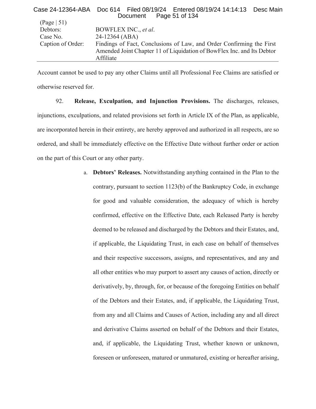 (Page | 51) Debtors: BOWFLEX INC., et al. Case No. 24-12364 (ABA) Caption of Order: Findings of Fact, Conclusions of Law, and Order Confirming the First Amended Joint Chapter 11 of Liquidation of BowFlex Inc. and Its Debtor Affiliate Account cannot be used to pay any other Claims until all Professional Fee Claims are satisfied or otherwise reserved for. 92. Release, Exculpation, and Injunction Provisions. The discharges, releases, injunctions, exculpations, and related provisions set forth in Article IX of the Plan, as applicable, are incorporated herein in their entirety, are hereby approved and authorized in all respects, are so ordered, and shall be immediately effective on the Effective Date without further order or action on the part of this Court or any other party. a. Debtors’ Releases. Notwithstanding anything contained in the Plan to the contrary, pursuant to section 1123(b) of the Bankruptcy Code, in exchange for good and valuable consideration, the adequacy of which is hereby confirmed, effective on the Effective Date, each Released Party is hereby deemed to be released and discharged by the Debtors and their Estates, and, if applicable, the Liquidating Trust, in each case on behalf of themselves and their respective successors, assigns, and representatives, and any and all other entities who may purport to assert any causes of action, directly or derivatively, by, through, for, or because of the foregoing Entities on behalf of the Debtors and their Estates, and, if applicable, the Liquidating Trust, from any and all Claims and Causes of Action, including any and all direct and derivative Claims asserted on behalf of the Debtors and their Estates, and, if applicable, the Liquidating Trust, whether known or unknown, foreseen or unforeseen, matured or unmatured, existing or hereafter arising, Case 24-12364-ABA Doc 614 Filed 08/19/24 Entered 08/19/24 14:14:13 Desc Main Document Page 51 of 134