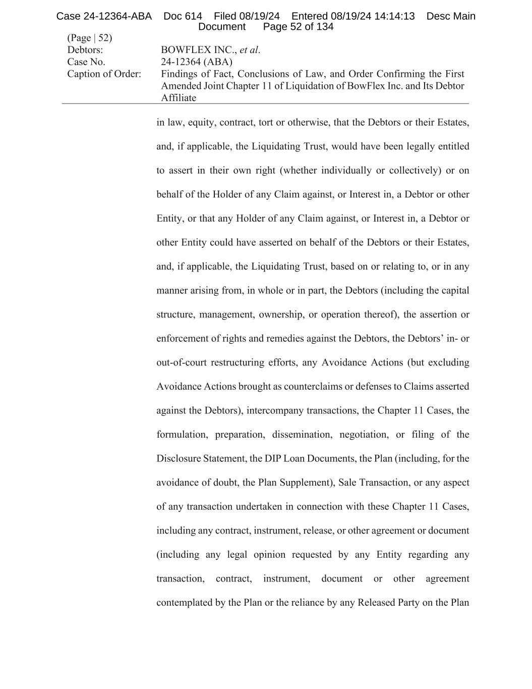 (Page | 52) Debtors: BOWFLEX INC., et al. Case No. 24-12364 (ABA) Caption of Order: Findings of Fact, Conclusions of Law, and Order Confirming the First Amended Joint Chapter 11 of Liquidation of BowFlex Inc. and Its Debtor Affiliate in law, equity, contract, tort or otherwise, that the Debtors or their Estates, and, if applicable, the Liquidating Trust, would have been legally entitled to assert in their own right (whether individually or collectively) or on behalf of the Holder of any Claim against, or Interest in, a Debtor or other Entity, or that any Holder of any Claim against, or Interest in, a Debtor or other Entity could have asserted on behalf of the Debtors or their Estates, and, if applicable, the Liquidating Trust, based on or relating to, or in any manner arising from, in whole or in part, the Debtors (including the capital structure, management, ownership, or operation thereof), the assertion or enforcement of rights and remedies against the Debtors, the Debtors’ in- or out-of-court restructuring efforts, any Avoidance Actions (but excluding Avoidance Actions brought as counterclaims or defenses to Claims asserted against the Debtors), intercompany transactions, the Chapter 11 Cases, the formulation, preparation, dissemination, negotiation, or filing of the Disclosure Statement, the DIP Loan Documents, the Plan (including, for the avoidance of doubt, the Plan Supplement), Sale Transaction, or any aspect of any transaction undertaken in connection with these Chapter 11 Cases, including any contract, instrument, release, or other agreement or document (including any legal opinion requested by any Entity regarding any transaction, contract, instrument, document or other agreement contemplated by the Plan or the reliance by any Released Party on the Plan Case 24-12364-ABA Doc 614 Filed 08/19/24 Entered 08/19/24 14:14:13 Desc Main Document Page 52 of 134
