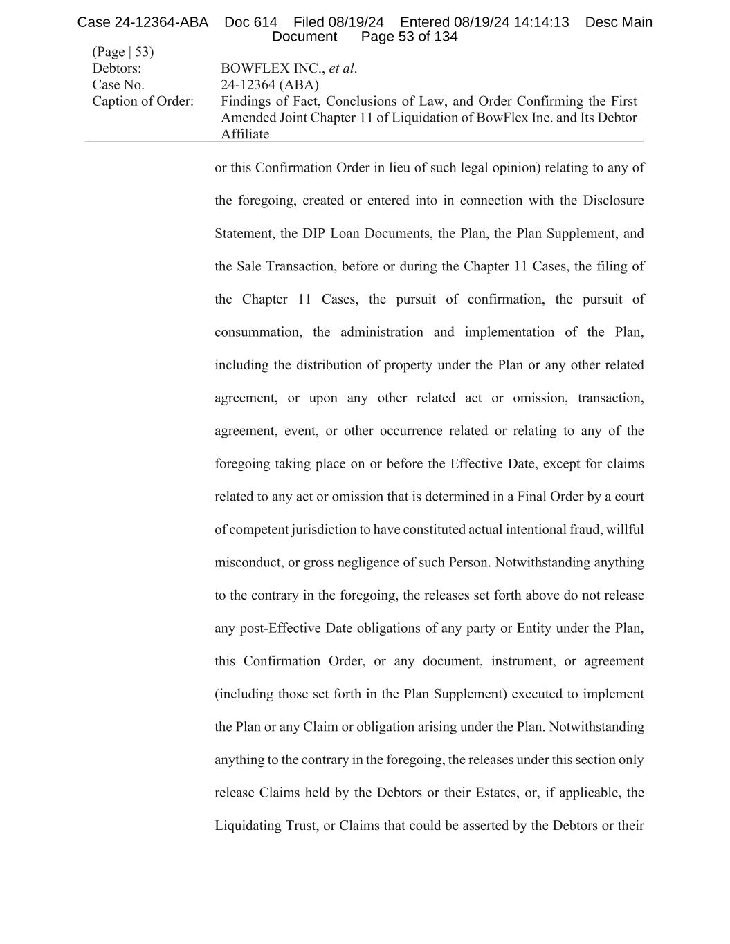 (Page | 53) Debtors: BOWFLEX INC., et al. Case No. 24-12364 (ABA) Caption of Order: Findings of Fact, Conclusions of Law, and Order Confirming the First Amended Joint Chapter 11 of Liquidation of BowFlex Inc. and Its Debtor Affiliate or this Confirmation Order in lieu of such legal opinion) relating to any of the foregoing, created or entered into in connection with the Disclosure Statement, the DIP Loan Documents, the Plan, the Plan Supplement, and the Sale Transaction, before or during the Chapter 11 Cases, the filing of the Chapter 11 Cases, the pursuit of confirmation, the pursuit of consummation, the administration and implementation of the Plan, including the distribution of property under the Plan or any other related agreement, or upon any other related act or omission, transaction, agreement, event, or other occurrence related or relating to any of the foregoing taking place on or before the Effective Date, except for claims related to any act or omission that is determined in a Final Order by a court of competent jurisdiction to have constituted actual intentional fraud, willful misconduct, or gross negligence of such Person. Notwithstanding anything to the contrary in the foregoing, the releases set forth above do not release any post-Effective Date obligations of any party or Entity under the Plan, this Confirmation Order, or any document, instrument, or agreement (including those set forth in the Plan Supplement) executed to implement the Plan or any Claim or obligation arising under the Plan. Notwithstanding anything to the contrary in the foregoing, the releases under this section only release Claims held by the Debtors or their Estates, or, if applicable, the Liquidating Trust, or Claims that could be asserted by the Debtors or their Case 24-12364-ABA Doc 614 Filed 08/19/24 Entered 08/19/24 14:14:13 Desc Main Document Page 53 of 134