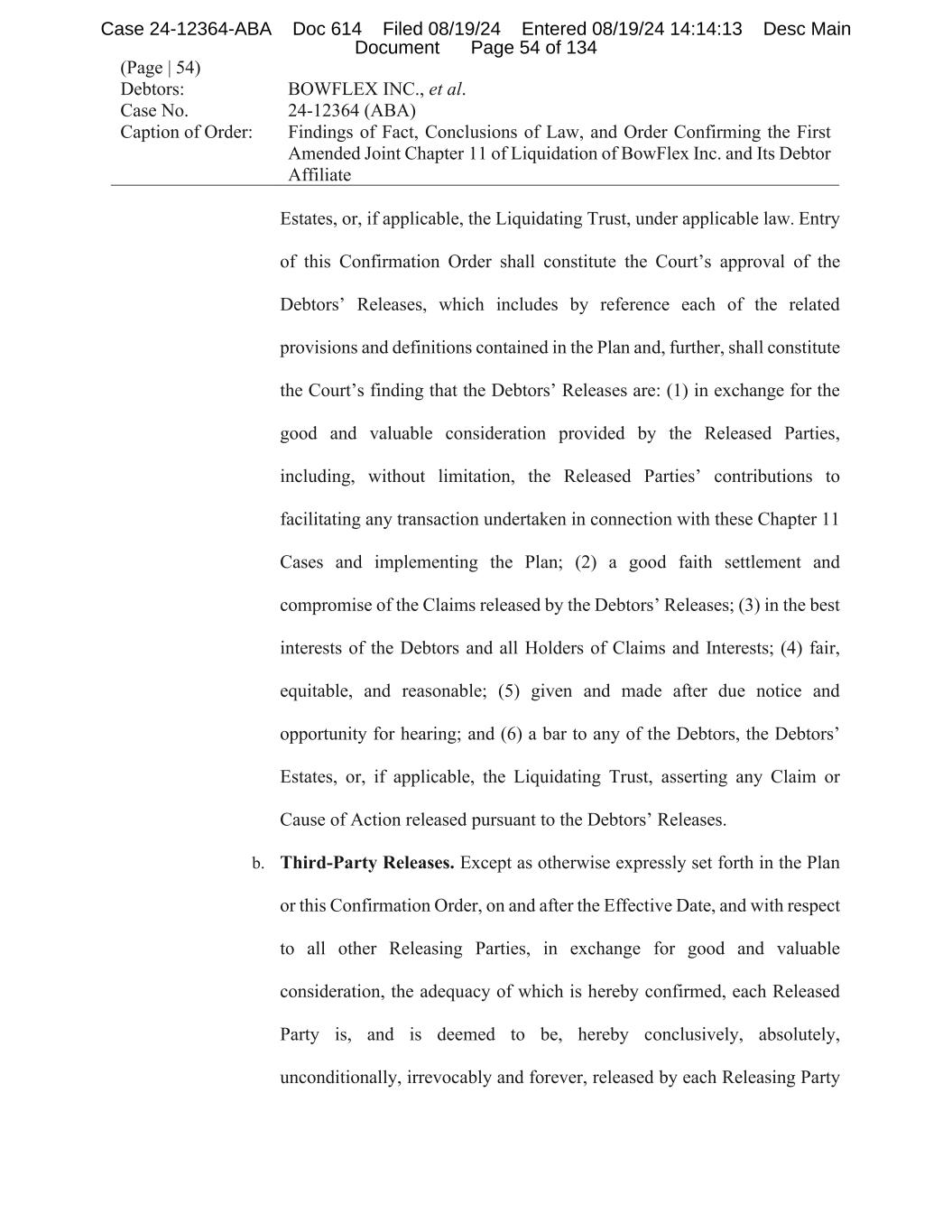 (Page | 54) Debtors: BOWFLEX INC., et al. Case No. 24-12364 (ABA) Caption of Order: Findings of Fact, Conclusions of Law, and Order Confirming the First Amended Joint Chapter 11 of Liquidation of BowFlex Inc. and Its Debtor Affiliate Estates, or, if applicable, the Liquidating Trust, under applicable law. Entry of this Confirmation Order shall constitute the Court’s approval of the Debtors’ Releases, which includes by reference each of the related provisions and definitions contained in the Plan and, further, shall constitute the Court’s finding that the Debtors’ Releases are: (1) in exchange for the good and valuable consideration provided by the Released Parties, including, without limitation, the Released Parties’ contributions to facilitating any transaction undertaken in connection with these Chapter 11 Cases and implementing the Plan; (2) a good faith settlement and compromise of the Claims released by the Debtors’ Releases; (3) in the best interests of the Debtors and all Holders of Claims and Interests; (4) fair, equitable, and reasonable; (5) given and made after due notice and opportunity for hearing; and (6) a bar to any of the Debtors, the Debtors’ Estates, or, if applicable, the Liquidating Trust, asserting any Claim or Cause of Action released pursuant to the Debtors’ Releases. b. Third-Party Releases. Except as otherwise expressly set forth in the Plan or this Confirmation Order, on and after the Effective Date, and with respect to all other Releasing Parties, in exchange for good and valuable consideration, the adequacy of which is hereby confirmed, each Released Party is, and is deemed to be, hereby conclusively, absolutely, unconditionally, irrevocably and forever, released by each Releasing Party Case 24-12364-ABA Doc 614 Filed 08/19/24 Entered 08/19/24 14:14:13 Desc Main Document Page 54 of 134