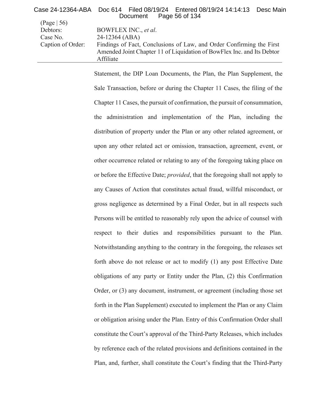 (Page | 56) Debtors: BOWFLEX INC., et al. Case No. 24-12364 (ABA) Caption of Order: Findings of Fact, Conclusions of Law, and Order Confirming the First Amended Joint Chapter 11 of Liquidation of BowFlex Inc. and Its Debtor Affiliate Statement, the DIP Loan Documents, the Plan, the Plan Supplement, the Sale Transaction, before or during the Chapter 11 Cases, the filing of the Chapter 11 Cases, the pursuit of confirmation, the pursuit of consummation, the administration and implementation of the Plan, including the distribution of property under the Plan or any other related agreement, or upon any other related act or omission, transaction, agreement, event, or other occurrence related or relating to any of the foregoing taking place on or before the Effective Date; provided, that the foregoing shall not apply to any Causes of Action that constitutes actual fraud, willful misconduct, or gross negligence as determined by a Final Order, but in all respects such Persons will be entitled to reasonably rely upon the advice of counsel with respect to their duties and responsibilities pursuant to the Plan. Notwithstanding anything to the contrary in the foregoing, the releases set forth above do not release or act to modify (1) any post Effective Date obligations of any party or Entity under the Plan, (2) this Confirmation Order, or (3) any document, instrument, or agreement (including those set forth in the Plan Supplement) executed to implement the Plan or any Claim or obligation arising under the Plan. Entry of this Confirmation Order shall constitute the Court’s approval of the Third-Party Releases, which includes by reference each of the related provisions and definitions contained in the Plan, and, further, shall constitute the Court’s finding that the Third-Party Case 24-12364-ABA Doc 614 Filed 08/19/24 Entered 08/19/24 14:14:13 Desc Main Document Page 56 of 134