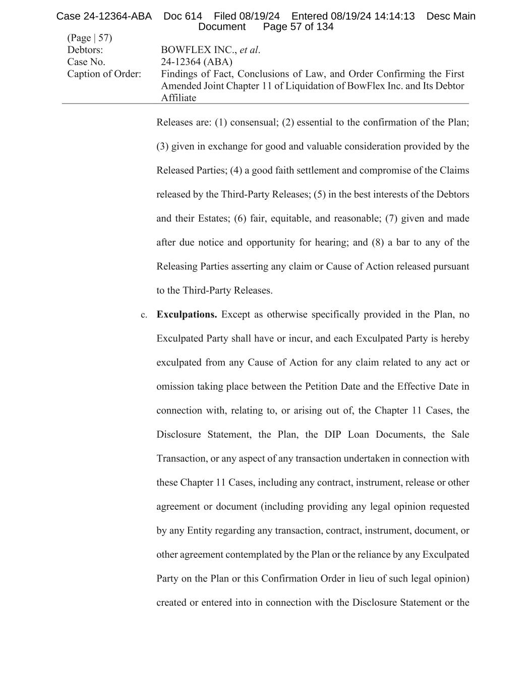 (Page | 57) Debtors: BOWFLEX INC., et al. Case No. 24-12364 (ABA) Caption of Order: Findings of Fact, Conclusions of Law, and Order Confirming the First Amended Joint Chapter 11 of Liquidation of BowFlex Inc. and Its Debtor Affiliate Releases are: (1) consensual; (2) essential to the confirmation of the Plan; (3) given in exchange for good and valuable consideration provided by the Released Parties; (4) a good faith settlement and compromise of the Claims released by the Third-Party Releases; (5) in the best interests of the Debtors and their Estates; (6) fair, equitable, and reasonable; (7) given and made after due notice and opportunity for hearing; and (8) a bar to any of the Releasing Parties asserting any claim or Cause of Action released pursuant to the Third-Party Releases. c. Exculpations. Except as otherwise specifically provided in the Plan, no Exculpated Party shall have or incur, and each Exculpated Party is hereby exculpated from any Cause of Action for any claim related to any act or omission taking place between the Petition Date and the Effective Date in connection with, relating to, or arising out of, the Chapter 11 Cases, the Disclosure Statement, the Plan, the DIP Loan Documents, the Sale Transaction, or any aspect of any transaction undertaken in connection with these Chapter 11 Cases, including any contract, instrument, release or other agreement or document (including providing any legal opinion requested by any Entity regarding any transaction, contract, instrument, document, or other agreement contemplated by the Plan or the reliance by any Exculpated Party on the Plan or this Confirmation Order in lieu of such legal opinion) created or entered into in connection with the Disclosure Statement or the Case 24-12364-ABA Doc 614 Filed 08/19/24 Entered 08/19/24 14:14:13 Desc Main Document Page 57 of 134