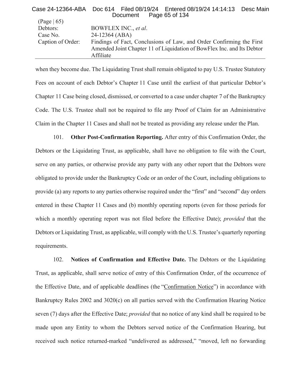 (Page | 65) Debtors: BOWFLEX INC., et al. Case No. 24-12364 (ABA) Caption of Order: Findings of Fact, Conclusions of Law, and Order Confirming the First Amended Joint Chapter 11 of Liquidation of BowFlex Inc. and Its Debtor Affiliate when they become due. The Liquidating Trust shall remain obligated to pay U.S. Trustee Statutory Fees on account of each Debtor’s Chapter 11 Case until the earliest of that particular Debtor’s Chapter 11 Case being closed, dismissed, or converted to a case under chapter 7 of the Bankruptcy Code. The U.S. Trustee shall not be required to file any Proof of Claim for an Administrative Claim in the Chapter 11 Cases and shall not be treated as providing any release under the Plan. 101. Other Post-Confirmation Reporting. After entry of this Confirmation Order, the Debtors or the Liquidating Trust, as applicable, shall have no obligation to file with the Court, serve on any parties, or otherwise provide any party with any other report that the Debtors were obligated to provide under the Bankruptcy Code or an order of the Court, including obligations to provide (a) any reports to any parties otherwise required under the “first” and “second” day orders entered in these Chapter 11 Cases and (b) monthly operating reports (even for those periods for which a monthly operating report was not filed before the Effective Date); provided that the Debtors or Liquidating Trust, as applicable, will comply with the U.S. Trustee’s quarterly reporting requirements. 102. Notices of Confirmation and Effective Date. The Debtors or the Liquidating Trust, as applicable, shall serve notice of entry of this Confirmation Order, of the occurrence of the Effective Date, and of applicable deadlines (the “Confirmation Notice”) in accordance with Bankruptcy Rules 2002 and 3020(c) on all parties served with the Confirmation Hearing Notice seven (7) days after the Effective Date; provided that no notice of any kind shall be required to be made upon any Entity to whom the Debtors served notice of the Confirmation Hearing, but received such notice returned-marked “undelivered as addressed,” “moved, left no forwarding Case 24-12364-ABA Doc 614 Filed 08/19/24 Entered 08/19/24 14:14:13 Desc Main Document Page 65 of 134