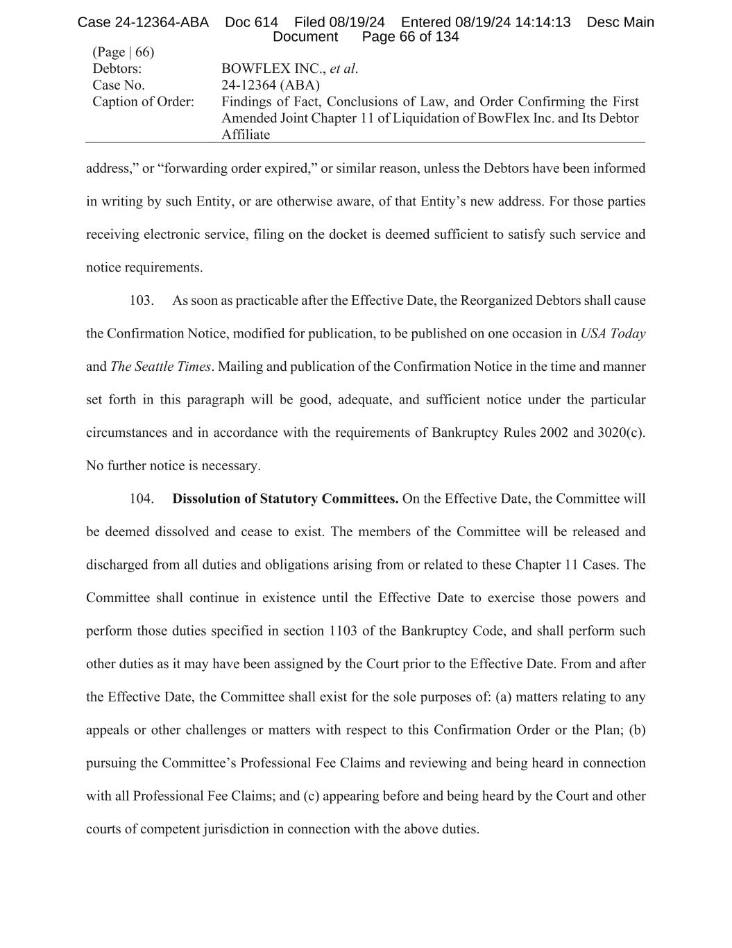 (Page | 66) Debtors: BOWFLEX INC., et al. Case No. 24-12364 (ABA) Caption of Order: Findings of Fact, Conclusions of Law, and Order Confirming the First Amended Joint Chapter 11 of Liquidation of BowFlex Inc. and Its Debtor Affiliate address,” or “forwarding order expired,” or similar reason, unless the Debtors have been informed in writing by such Entity, or are otherwise aware, of that Entity’s new address. For those parties receiving electronic service, filing on the docket is deemed sufficient to satisfy such service and notice requirements. 103. As soon as practicable after the Effective Date, the Reorganized Debtors shall cause the Confirmation Notice, modified for publication, to be published on one occasion in USA Today and The Seattle Times. Mailing and publication of the Confirmation Notice in the time and manner set forth in this paragraph will be good, adequate, and sufficient notice under the particular circumstances and in accordance with the requirements of Bankruptcy Rules 2002 and 3020(c). No further notice is necessary. 104. Dissolution of Statutory Committees. On the Effective Date, the Committee will be deemed dissolved and cease to exist. The members of the Committee will be released and discharged from all duties and obligations arising from or related to these Chapter 11 Cases. The Committee shall continue in existence until the Effective Date to exercise those powers and perform those duties specified in section 1103 of the Bankruptcy Code, and shall perform such other duties as it may have been assigned by the Court prior to the Effective Date. From and after the Effective Date, the Committee shall exist for the sole purposes of: (a) matters relating to any appeals or other challenges or matters with respect to this Confirmation Order or the Plan; (b) pursuing the Committee’s Professional Fee Claims and reviewing and being heard in connection with all Professional Fee Claims; and (c) appearing before and being heard by the Court and other courts of competent jurisdiction in connection with the above duties. Case 24-12364-ABA Doc 614 Filed 08/19/24 Entered 08/19/24 14:14:13 Desc Main Document Page 66 of 134