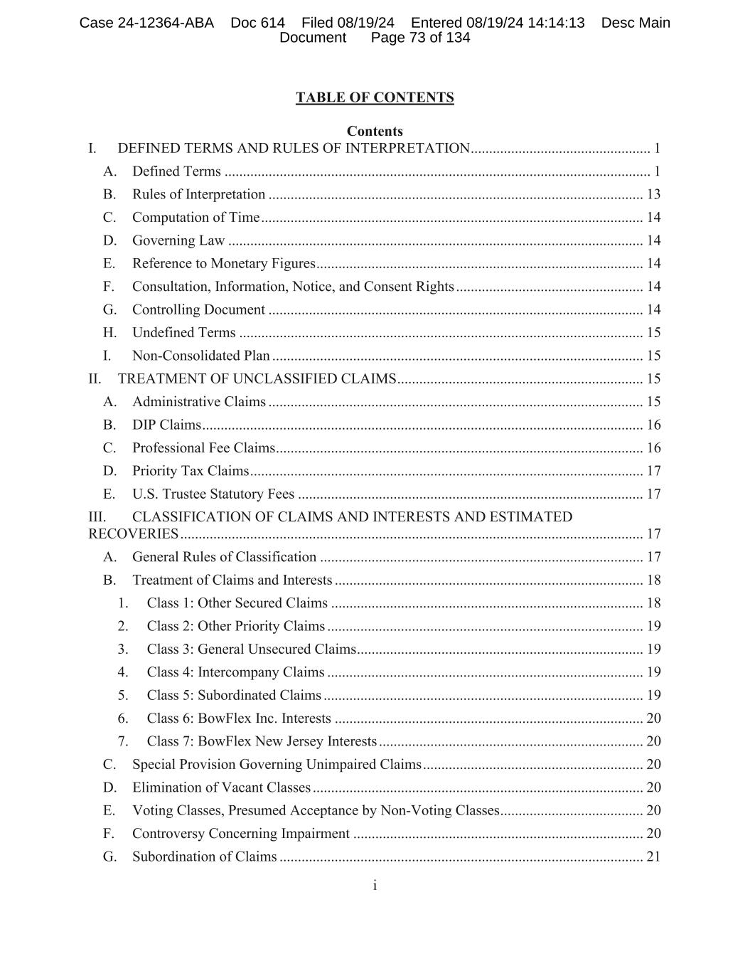 i TABLE OF CONTENTS Contents I. DEFINED TERMS AND RULES OF INTERPRETATION ................................................. 1 A. Defined Terms .................................................................................................................... 1 B. Rules of Interpretation ...................................................................................................... 13 C. Computation of Time ........................................................................................................ 14 D. Governing Law ................................................................................................................. 14 E. Reference to Monetary Figures ......................................................................................... 14 F. Consultation, Information, Notice, and Consent Rights ................................................... 14 G. Controlling Document ...................................................................................................... 14 H. Undefined Terms .............................................................................................................. 15 I. Non-Consolidated Plan ..................................................................................................... 15 II. TREATMENT OF UNCLASSIFIED CLAIMS ................................................................... 15 A. Administrative Claims ...................................................................................................... 15 B. DIP Claims ........................................................................................................................ 16 C. Professional Fee Claims .................................................................................................... 16 D. Priority Tax Claims ........................................................................................................... 17 E. U.S. Trustee Statutory Fees .............................................................................................. 17 III. CLASSIFICATION OF CLAIMS AND INTERESTS AND ESTIMATED RECOVERIES .............................................................................................................................. 17 A. General Rules of Classification ........................................................................................ 17 B. Treatment of Claims and Interests .................................................................................... 18 1. Class 1: Other Secured Claims ..................................................................................... 18 2. Class 2: Other Priority Claims ...................................................................................... 19 3. Class 3: General Unsecured Claims .............................................................................. 19 4. Class 4: Intercompany Claims ...................................................................................... 19 5. Class 5: Subordinated Claims ....................................................................................... 19 6. Class 6: BowFlex Inc. Interests .................................................................................... 20 7. Class 7: BowFlex New Jersey Interests ........................................................................ 20 C. Special Provision Governing Unimpaired Claims ............................................................ 20 D. Elimination of Vacant Classes .......................................................................................... 20 E. Voting Classes, Presumed Acceptance by Non-Voting Classes ....................................... 20 F. Controversy Concerning Impairment ............................................................................... 20 G. Subordination of Claims ................................................................................................... 21 Case 24-12364-ABA Doc 614 Filed 08/19/24 Entered 08/19/24 14:14:13 Desc Main Document Page 73 of 134