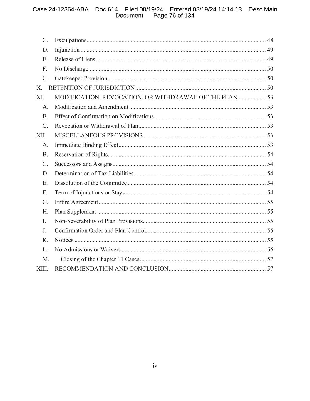 iv C. Exculpations ...................................................................................................................... 48 D. Injunction .......................................................................................................................... 49 E. Release of Liens ................................................................................................................ 49 F. No Discharge .................................................................................................................... 50 G. Gatekeeper Provision ........................................................................................................ 50 X. RETENTION OF JURISDICTION ...................................................................................... 50 XI. MODIFICATION, REVOCATION, OR WITHDRAWAL OF THE PLAN .................. 53 A. Modification and Amendment .......................................................................................... 53 B. Effect of Confirmation on Modifications ......................................................................... 53 C. Revocation or Withdrawal of Plan .................................................................................... 53 XII. MISCELLANEOUS PROVISIONS ................................................................................. 53 A. Immediate Binding Effect ................................................................................................. 53 B. Reservation of Rights ........................................................................................................ 54 C. Successors and Assigns..................................................................................................... 54 D. Determination of Tax Liabilities ....................................................................................... 54 E. Dissolution of the Committee ........................................................................................... 54 F. Term of Injunctions or Stays............................................................................................. 54 G. Entire Agreement .............................................................................................................. 55 H. Plan Supplement ............................................................................................................... 55 I. Non-Severability of Plan Provisions ................................................................................. 55 J. Confirmation Order and Plan Control ............................................................................... 55 K. Notices .............................................................................................................................. 55 L. No Admissions or Waivers ............................................................................................... 56 M. Closing of the Chapter 11 Cases ................................................................................... 57 XIII. RECOMMENDATION AND CONCLUSION ................................................................ 57 Case 24-12364-ABA Doc 614 Filed 08/19/24 Entered 08/19/24 14:14:13 Desc Main Document Page 76 of 134