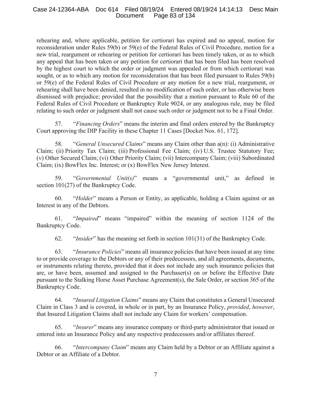 7 rehearing and, where applicable, petition for certiorari has expired and no appeal, motion for reconsideration under Rules 59(b) or 59(e) of the Federal Rules of Civil Procedure, motion for a new trial, reargument or rehearing or petition for certiorari has been timely taken, or as to which any appeal that has been taken or any petition for certiorari that has been filed has been resolved by the highest court to which the order or judgment was appealed or from which certiorari was sought, or as to which any motion for reconsideration that has been filed pursuant to Rules 59(b) or 59(e) of the Federal Rules of Civil Procedure or any motion for a new trial, reargument, or rehearing shall have been denied, resulted in no modification of such order, or has otherwise been dismissed with prejudice; provided that the possibility that a motion pursuant to Rule 60 of the Federal Rules of Civil Procedure or Bankruptcy Rule 9024, or any analogous rule, may be filed relating to such order or judgment shall not cause such order or judgment not to be a Final Order. 57. “Financing Orders” means the interim and final orders entered by the Bankruptcy Court approving the DIP Facility in these Chapter 11 Cases [Docket Nos. 61, 172]. 58. “General Unsecured Claims” means any Claim other than a(n): (i) Administrative Claim; (ii) Priority Tax Claim; (iii) Professional Fee Claim; (iv) U.S. Trustee Statutory Fee; (v) Other Secured Claim; (vi) Other Priority Claim; (vii) Intercompany Claim; (viii) Subordinated Claim; (ix) BowFlex Inc. Interest; or (x) BowFlex New Jersey Interest. 59. “Governmental Unit(s)” means a “governmental unit,” as defined in section 101(27) of the Bankruptcy Code. 60. “Holder” means a Person or Entity, as applicable, holding a Claim against or an Interest in any of the Debtors. 61. “Impaired” means “impaired” within the meaning of section 1124 of the Bankruptcy Code. 62. “Insider” has the meaning set forth in section 101(31) of the Bankruptcy Code. 63. “Insurance Policies” means all insurance policies that have been issued at any time to or provide coverage to the Debtors or any of their predecessors, and all agreements, documents, or instruments relating thereto, provided that it does not include any such insurance policies that are, or have been, assumed and assigned to the Purchaser(s) on or before the Effective Date pursuant to the Stalking Horse Asset Purchase Agreement(s), the Sale Order, or section 365 of the Bankruptcy Code. 64. “Insured Litigation Claims” means any Claim that constitutes a General Unsecured Claim in Class 3 and is covered, in whole or in part, by an Insurance Policy, provided, however, that Insured Litigation Claims shall not include any Claim for workers’ compensation. 65. “Insurer” means any insurance company or third-party administrator that issued or entered into an Insurance Policy and any respective predecessors and/or affiliates thereof. 66. “Intercompany Claim” means any Claim held by a Debtor or an Affiliate against a Debtor or an Affiliate of a Debtor. Case 24-12364-ABA Doc 614 Filed 08/19/24 Entered 08/19/24 14:14:13 Desc Main Document Page 83 of 134