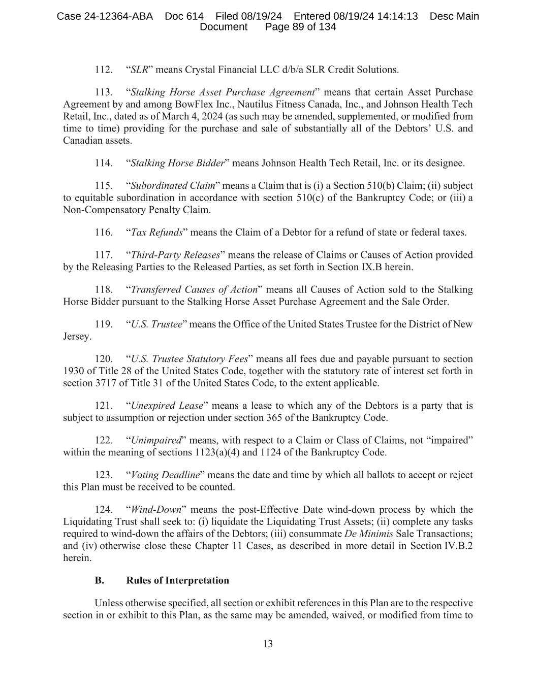 13 112. “SLR” means Crystal Financial LLC d/b/a SLR Credit Solutions. 113. “Stalking Horse Asset Purchase Agreement” means that certain Asset Purchase Agreement by and among BowFlex Inc., Nautilus Fitness Canada, Inc., and Johnson Health Tech Retail, Inc., dated as of March 4, 2024 (as such may be amended, supplemented, or modified from time to time) providing for the purchase and sale of substantially all of the Debtors’ U.S. and Canadian assets. 114. “Stalking Horse Bidder” means Johnson Health Tech Retail, Inc. or its designee. 115. “Subordinated Claim” means a Claim that is (i) a Section 510(b) Claim; (ii) subject to equitable subordination in accordance with section 510(c) of the Bankruptcy Code; or (iii) a Non-Compensatory Penalty Claim. 116. “Tax Refunds” means the Claim of a Debtor for a refund of state or federal taxes. 117. “Third-Party Releases” means the release of Claims or Causes of Action provided by the Releasing Parties to the Released Parties, as set forth in Section IX.B herein. 118. “Transferred Causes of Action” means all Causes of Action sold to the Stalking Horse Bidder pursuant to the Stalking Horse Asset Purchase Agreement and the Sale Order. 119. “U.S. Trustee” means the Office of the United States Trustee for the District of New Jersey. 120. “U.S. Trustee Statutory Fees” means all fees due and payable pursuant to section 1930 of Title 28 of the United States Code, together with the statutory rate of interest set forth in section 3717 of Title 31 of the United States Code, to the extent applicable. 121. “Unexpired Lease” means a lease to which any of the Debtors is a party that is subject to assumption or rejection under section 365 of the Bankruptcy Code. 122. “Unimpaired” means, with respect to a Claim or Class of Claims, not “impaired” within the meaning of sections 1123(a)(4) and 1124 of the Bankruptcy Code. 123. “Voting Deadline” means the date and time by which all ballots to accept or reject this Plan must be received to be counted. 124. “Wind-Down” means the post-Effective Date wind-down process by which the Liquidating Trust shall seek to: (i) liquidate the Liquidating Trust Assets; (ii) complete any tasks required to wind-down the affairs of the Debtors; (iii) consummate De Minimis Sale Transactions; and (iv) otherwise close these Chapter 11 Cases, as described in more detail in Section IV.B.2 herein. B. Rules of Interpretation Unless otherwise specified, all section or exhibit references in this Plan are to the respective section in or exhibit to this Plan, as the same may be amended, waived, or modified from time to Case 24-12364-ABA Doc 614 Filed 08/19/24 Entered 08/19/24 14:14:13 Desc Main Document Page 89 of 134